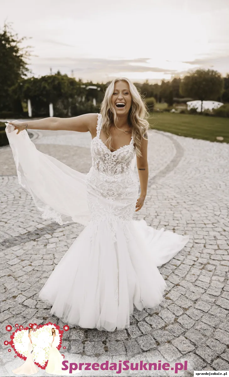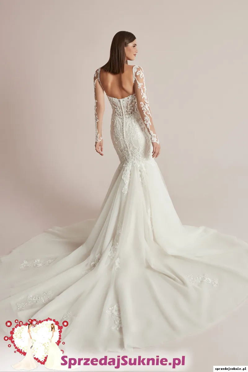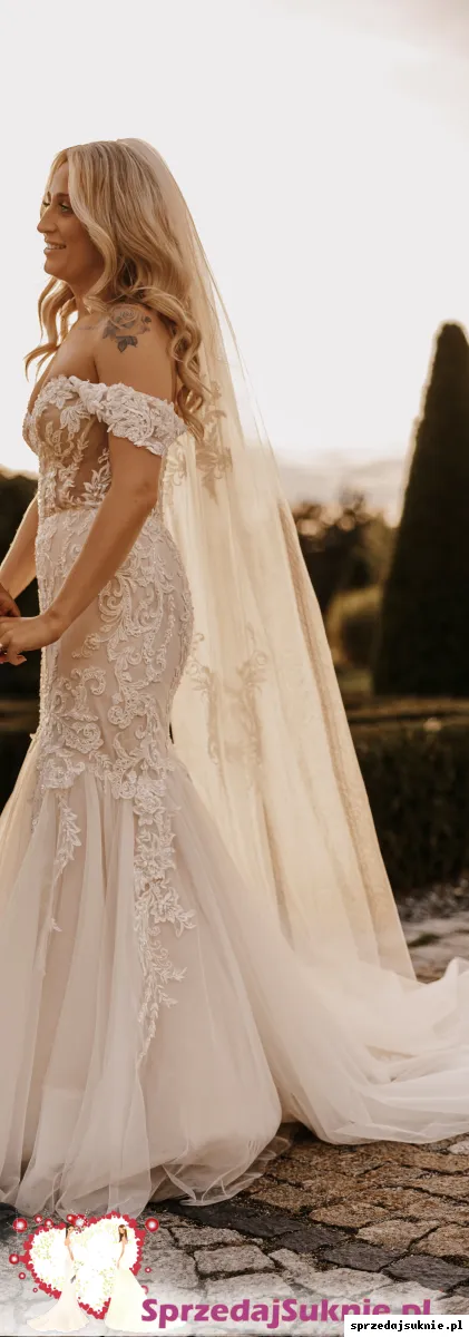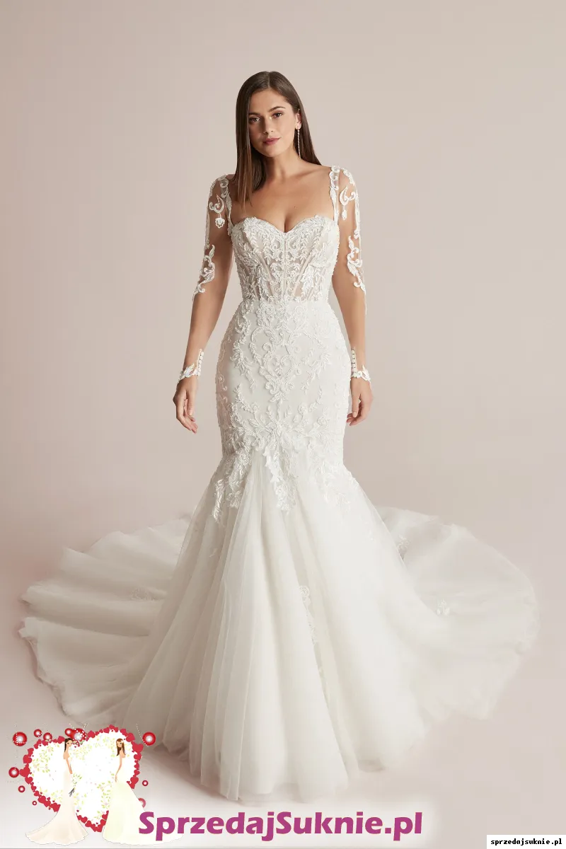 Na sprzedaż ekskluzywna koronkowa suknia syrenka z odczepianymi długimi rękawami i widocznym szkieletem. Suknia ślubna projektanta JUSTIN ALEXANDER (PINK CHAMP -IV-SIL-NUDE ) zakupiona w salonie LaDea w Poznaniu. Suknia w rozmiarze 38 szyta na wzrost 165 cm plus obcas 4cm.