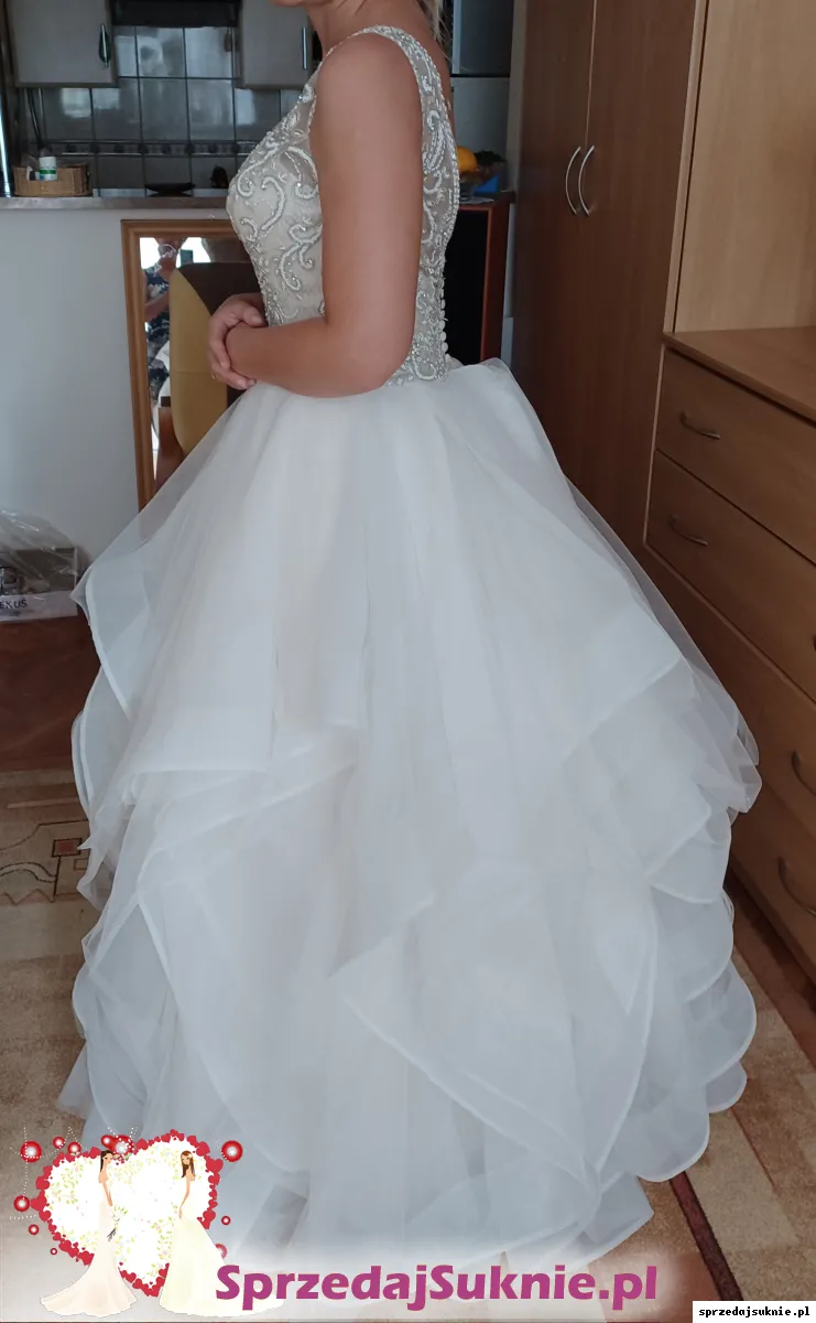 Jest to suknia typu księżniczka w kolorze ciepłej bieli - dół tworzą piękne pionowe falbany, które nadają sukni lekkości i uroku a gorset ozdobiony jest eleganckimi kryształkami. Suwak gorsetu ukryto za ozdobnymi guziczkami.