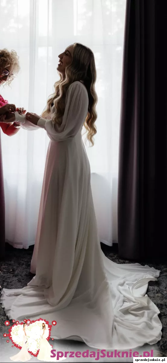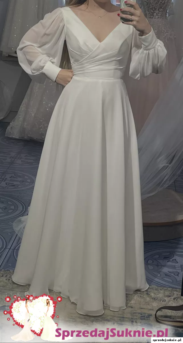 Prosta, swobodna i zwiewna suknia 艣lubna z szyfonu ma skromny dekolt w kszta艂cie litery V, podkre艣lony uwydatniaj膮cymi sylwetk臋 plisami z przodu i z ty艂u gorsetu. Lekkie, szyfonowe, bufiaste r臋kawy dodaj膮 modny akcent tej delikatnej stylizacji. Prosta sp贸dnica o linii A w komplecie z trenem ko艣cielnym zapewni Ci wygod臋 przez ca艂y dzie艅.