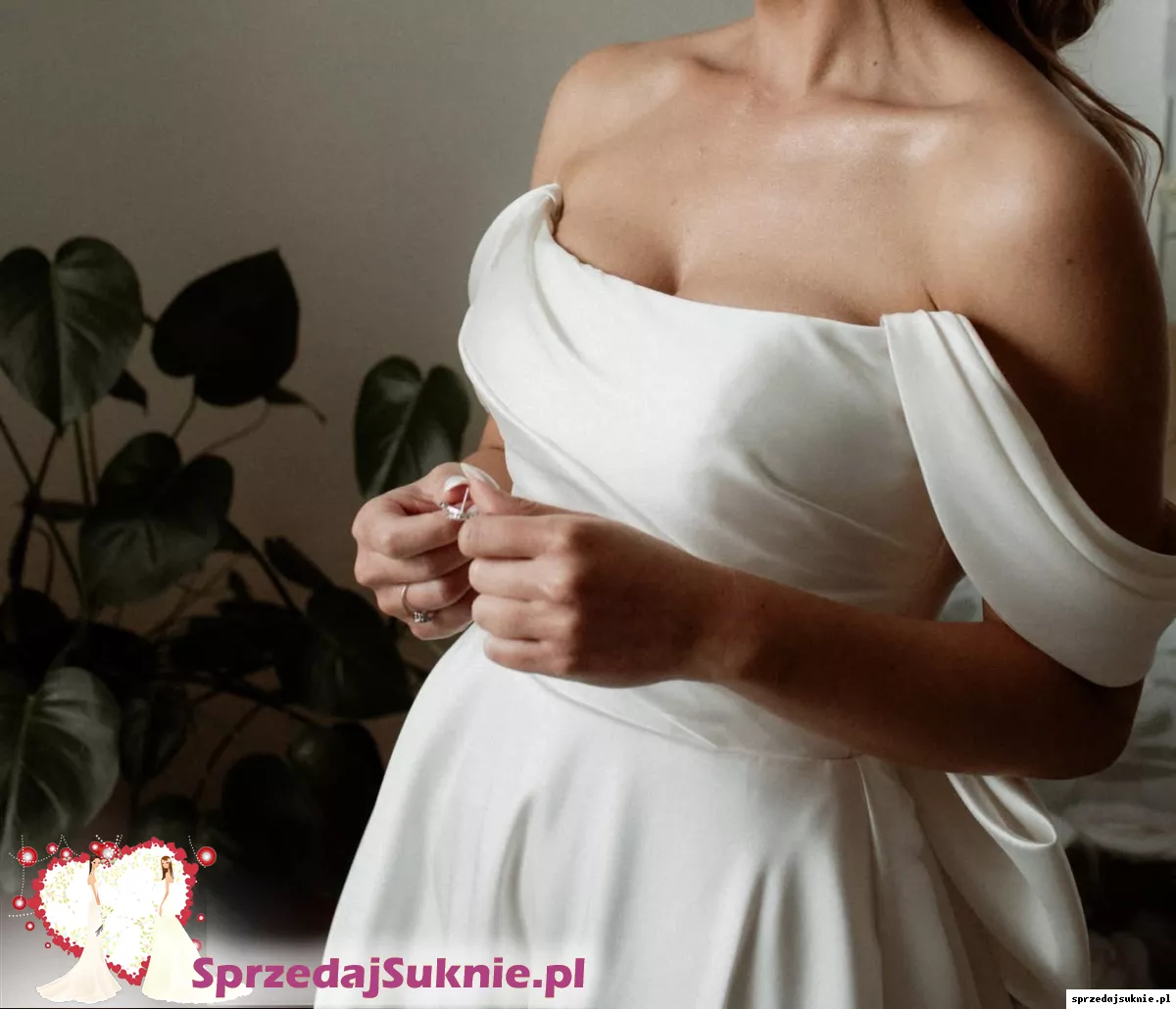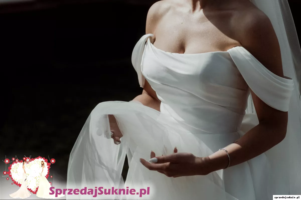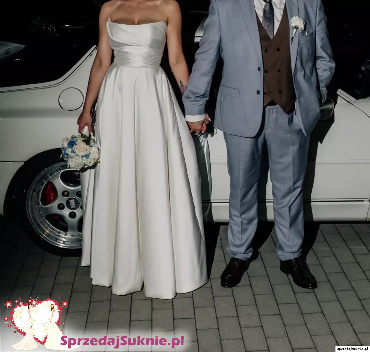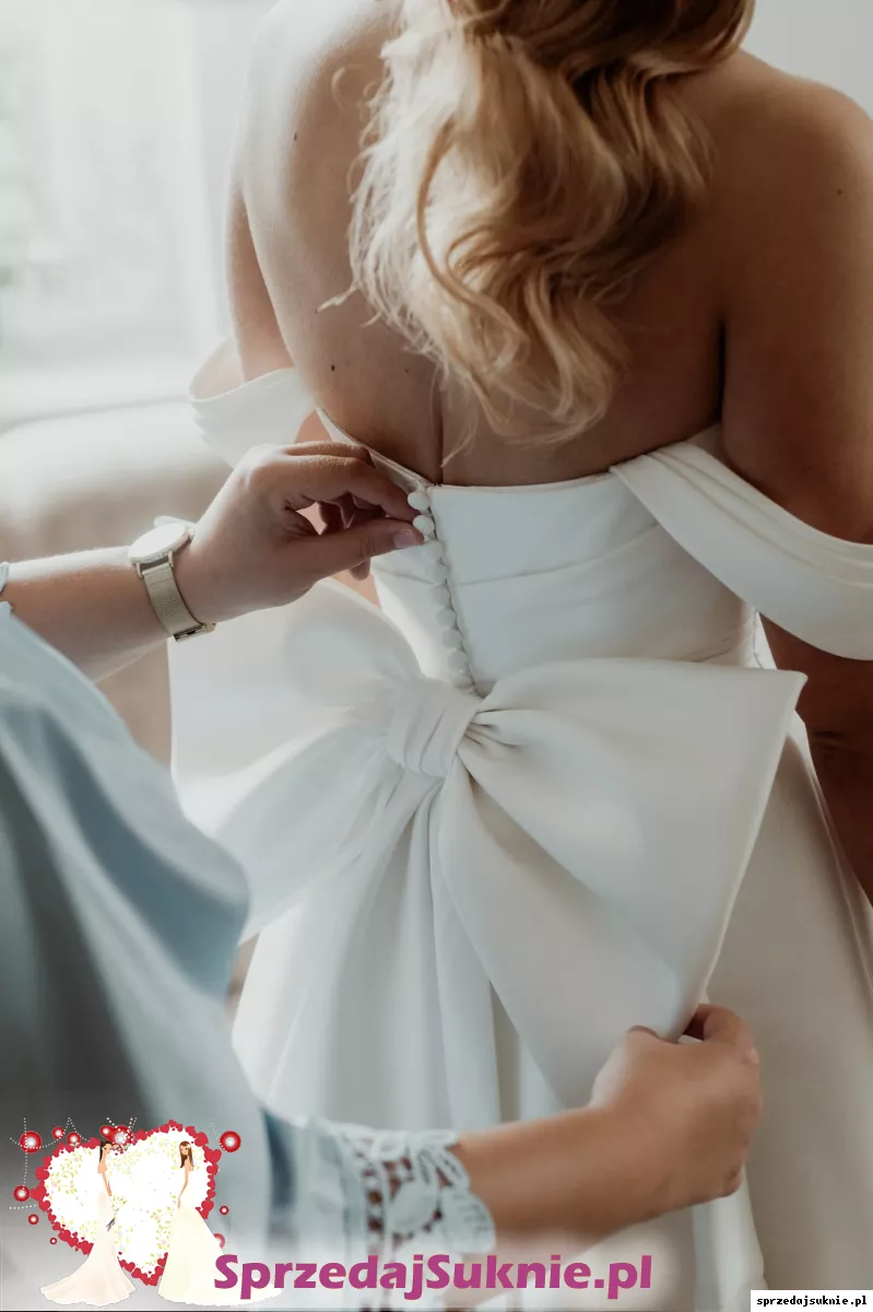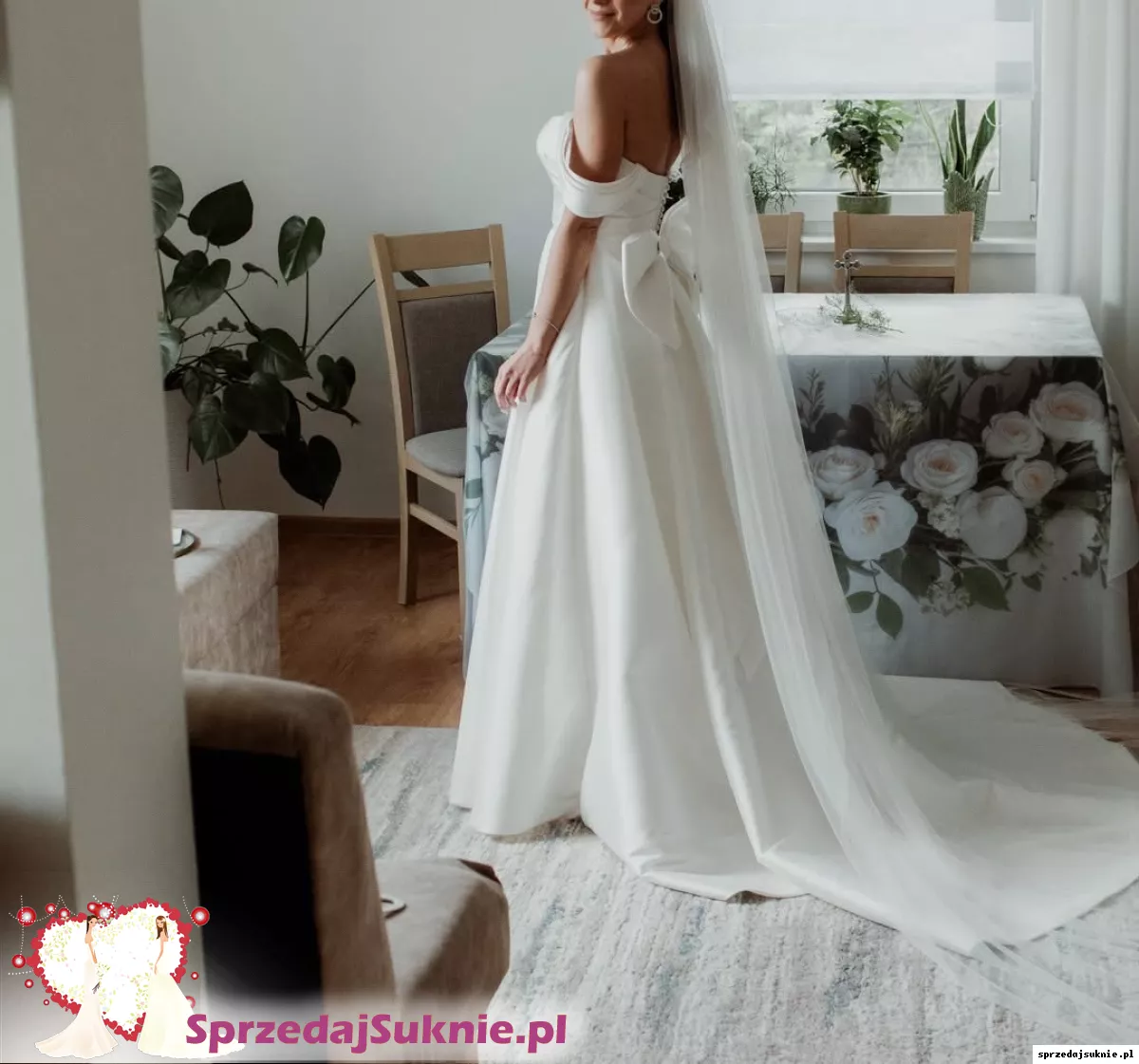 Klasyczna trapezowa suknia z gorsetem zdobionym plisowaniami i kokardą bez ramiączek. Tren jest podpinany, a kokardę można odpiąć, zapiąć w talii lub na dole trenu. Dodatkowo zostały uszyte odpinane ramiączka opadające oraz cienkie ramiączka dla komfortu.