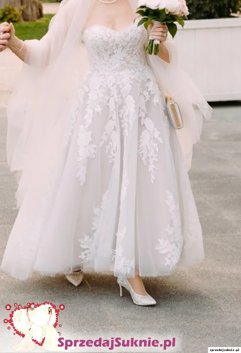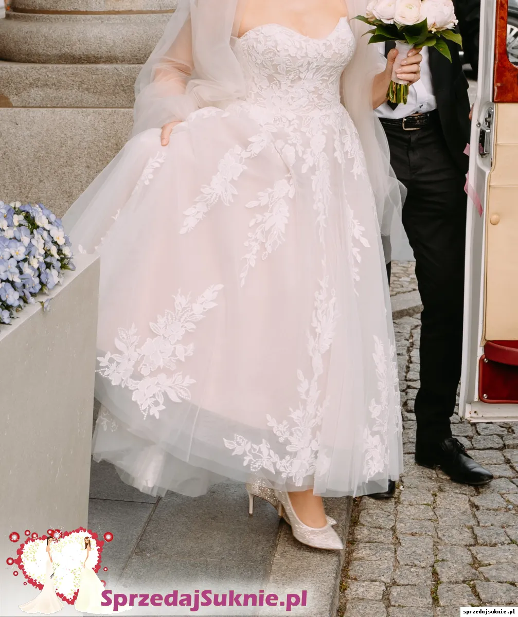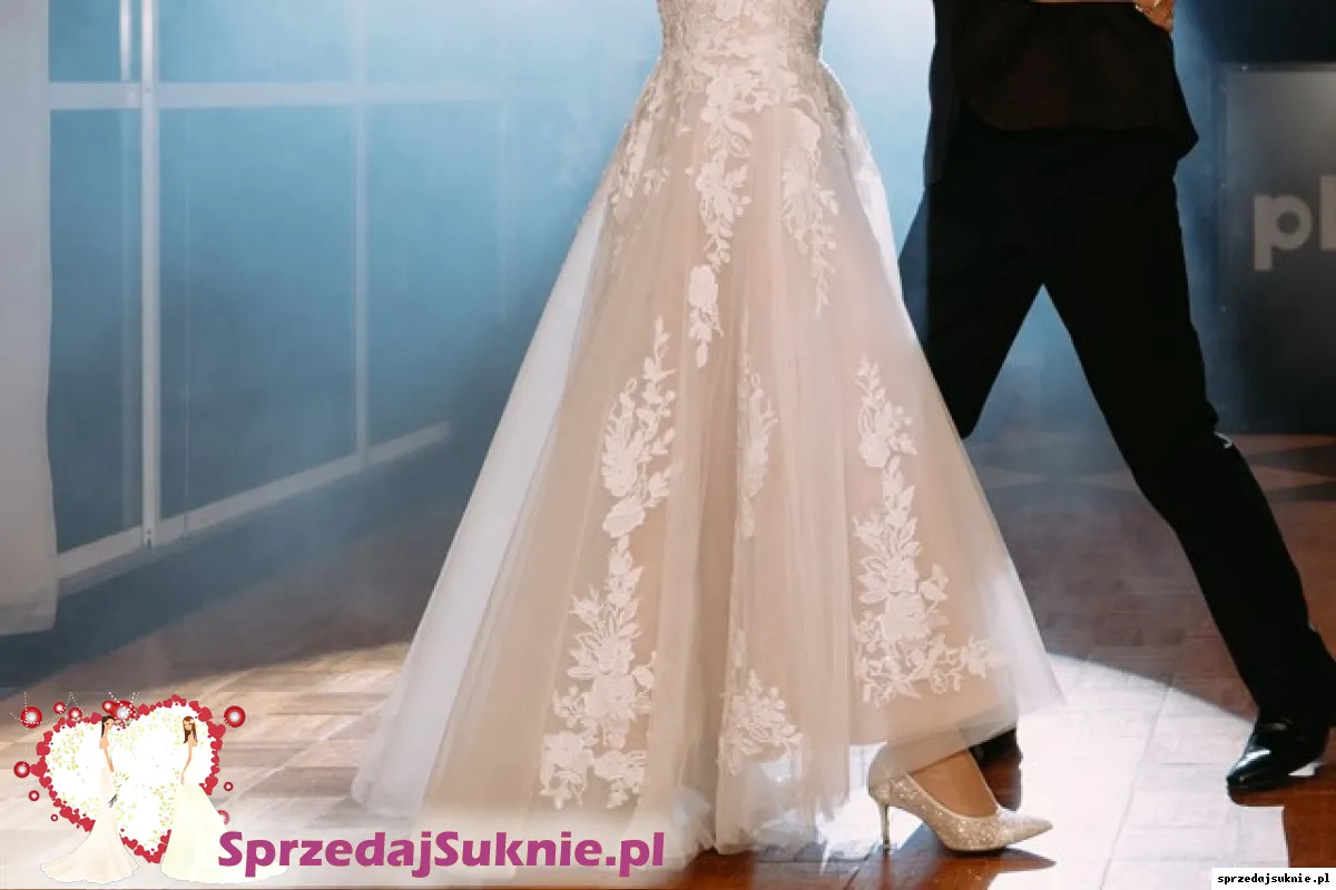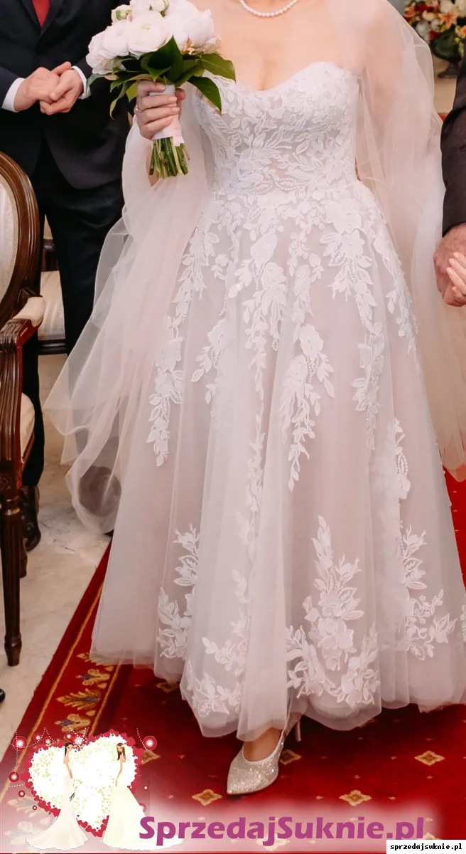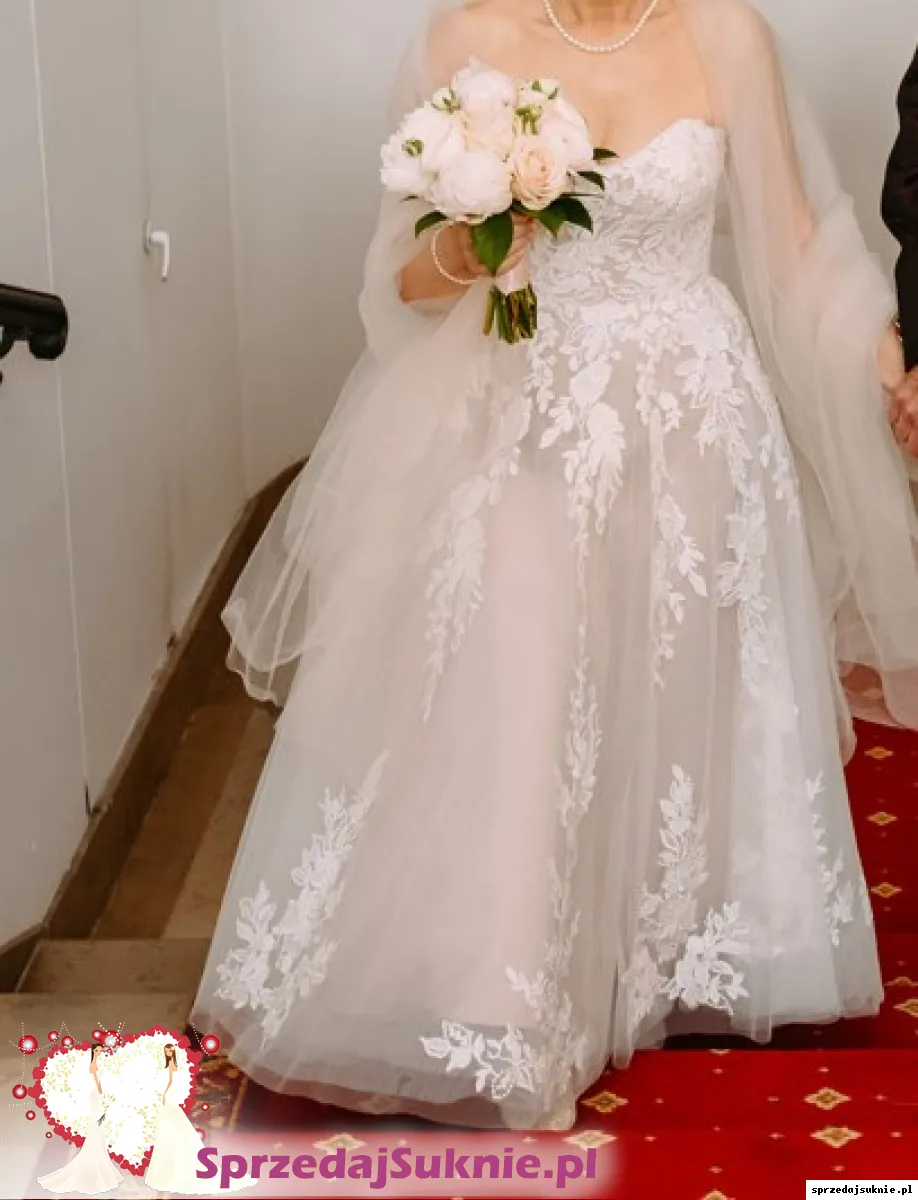 Suknia z amerykańskiej kolekcji Justin Alexander Signature 88255 style Ellie kupiona w Salonie WHITE w Warszawie. Zachwyciła wszystkich ! Elegancja, szyk, romantyzm. Pojawiając się przed gośćmi usłyszałam : « Wyglądasz zjawiskowo ... » Tak, zdecydowanie czułam sie w tej sukni jak księżniczka. Można uznać, że jest nowa, miałam ja na sobie kilka godzin; Z przodu troszkę krótsza tuż nad pantofelkami, z tyłu do ziemi. Naszyta koronka przechodzi z gorsetu w dół sukni, to istna maestria, gdzie niegdzie mieni się diamencikami; Jest na kilku warstwach tiulowych, kolor jednej z halek bardzo lekko karmelowy co podkresla biel koronki. Piękny szal z jedwabnego tiulu identyczny jak pierwsza warstwa sukni, w prezencie. Jesli masz nr buta 36, urocze pantofelki z diamencikami też w prezencie. Rozmiar sukni 36/38. Mój wzrost 158. Cena jest bardzo przystępna zważywszy na wyjatkową jakość i styl sukni zaprojektowanej przez wysokiej rangi stylistę. W salonie zapłaciłam 5990 zl . Dokumenty zakupu do wglądu.