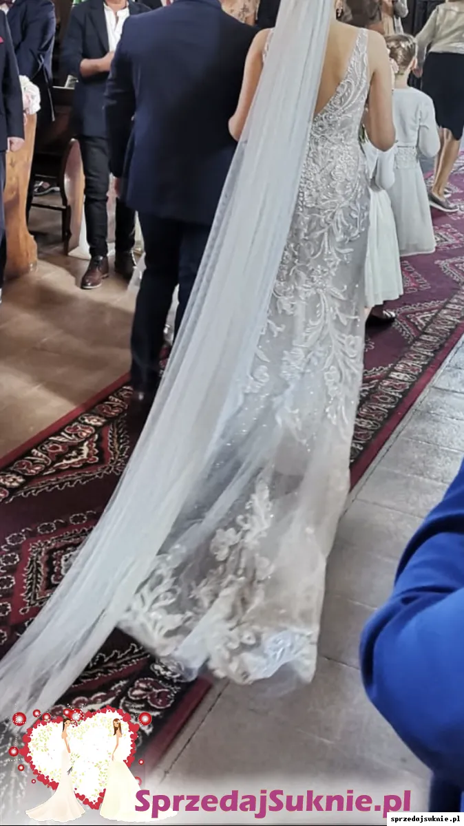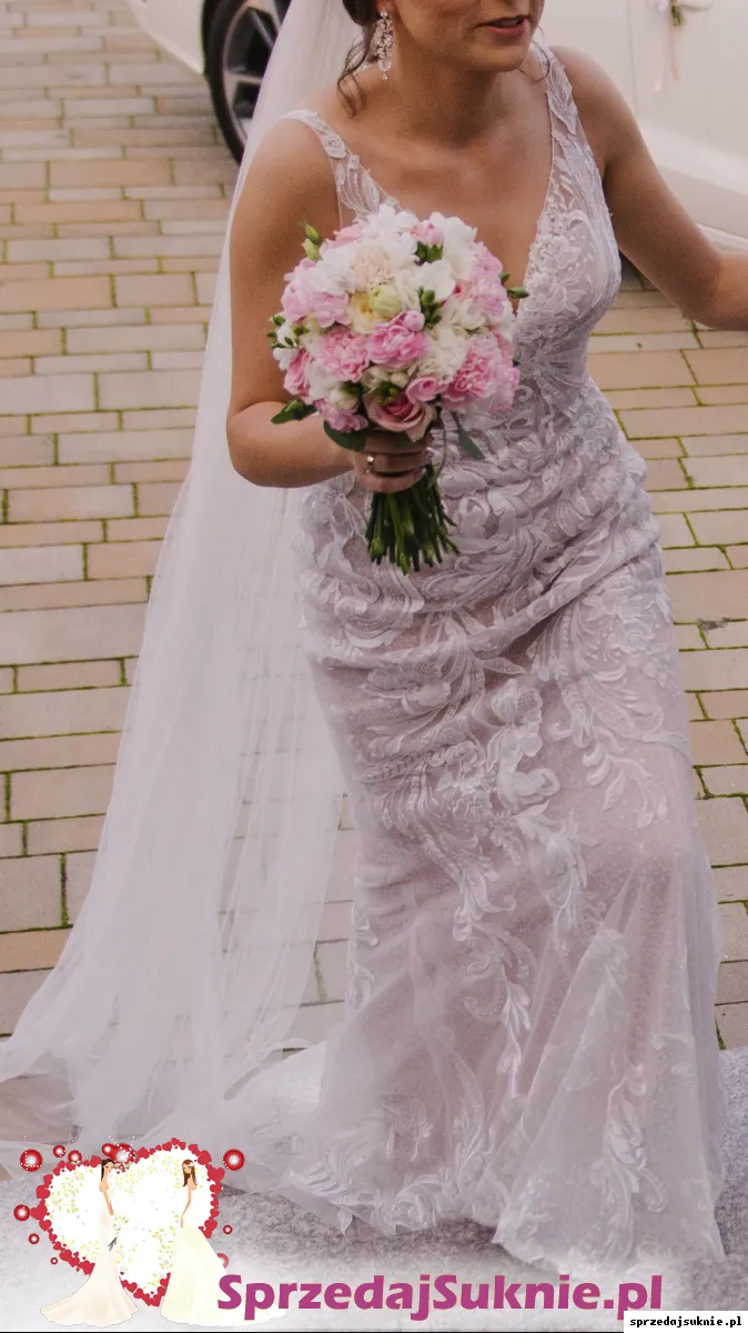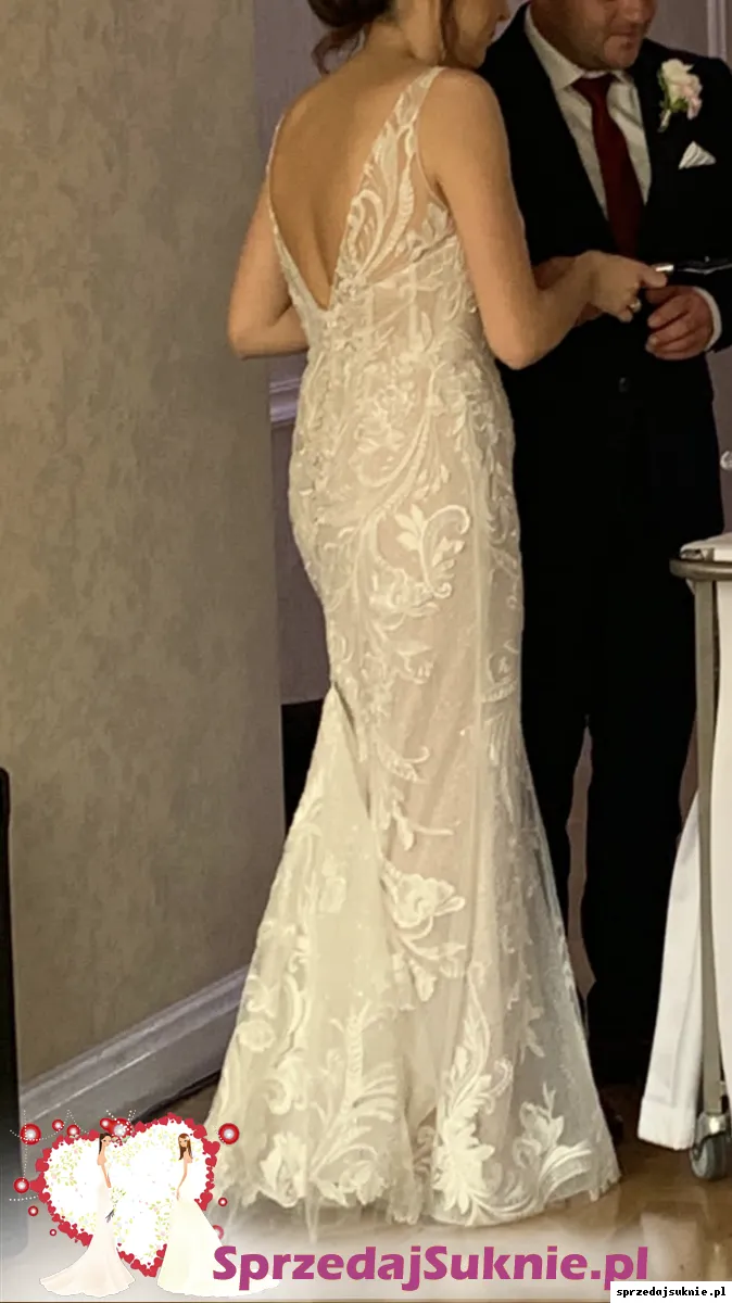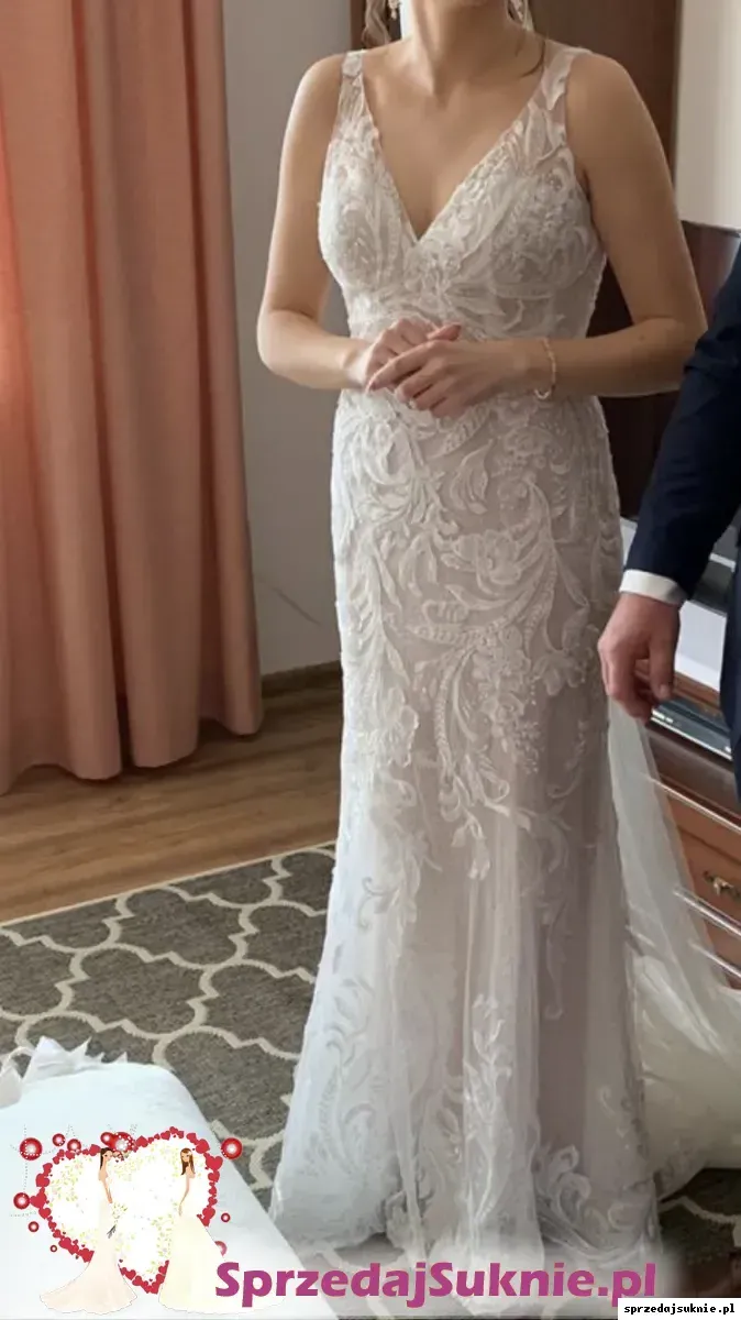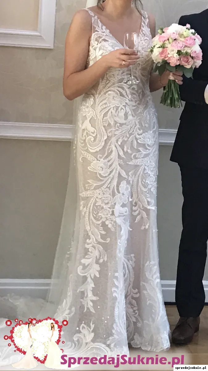 Przepi臋kna suknia dopasowana do sylwetki, rozszerzaj膮ca si臋 ku do艂owi. Wyrazista aplikacja z weneckiej koronki. Spodnia warstwa uszyta z cekinowej koronki nadaje subtelny po艂ysk. Podszewka w kolorze nude. Prz贸d i plecy wyci臋te w liter臋 V, zamek przykryty pi臋knymi guziczkami. Pod rami膮czkami silikon zapewniaj膮cy idealne dopasowanie sukni do cia艂a. G贸rna cz臋艣膰 delikatnie prze艣wituj膮ca. Ca艂o艣膰 dope艂nia niewielki tren, z mo偶liwo艣ci膮 podpi臋cia (niewidoczny guziczek plus dwa przezroczyste niewidoczne zatrzaski), tren zako艅czony tasiemk膮, kt贸r膮 mo偶na wykorzysta膰 do przytrzymania trenu przy chodzeniu.