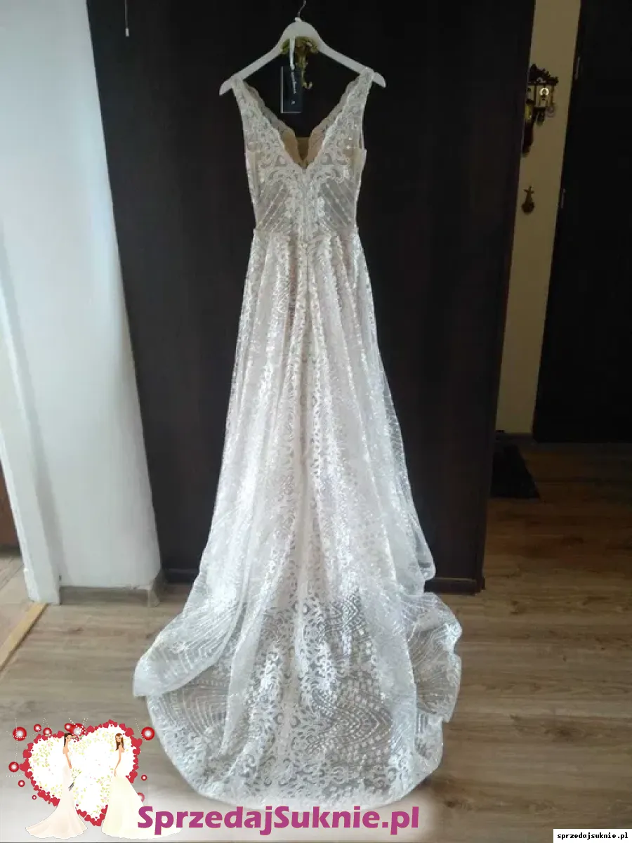 Suknia charakteryzuje się długim, podwieszanym trenem widocznym na zdjęciach.