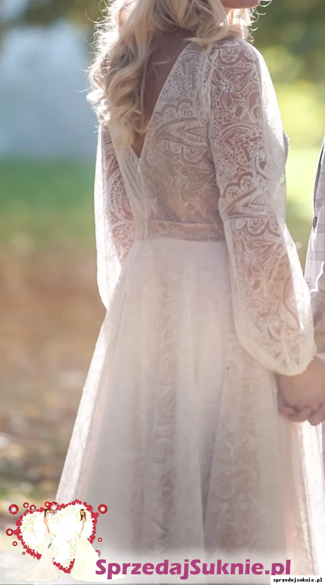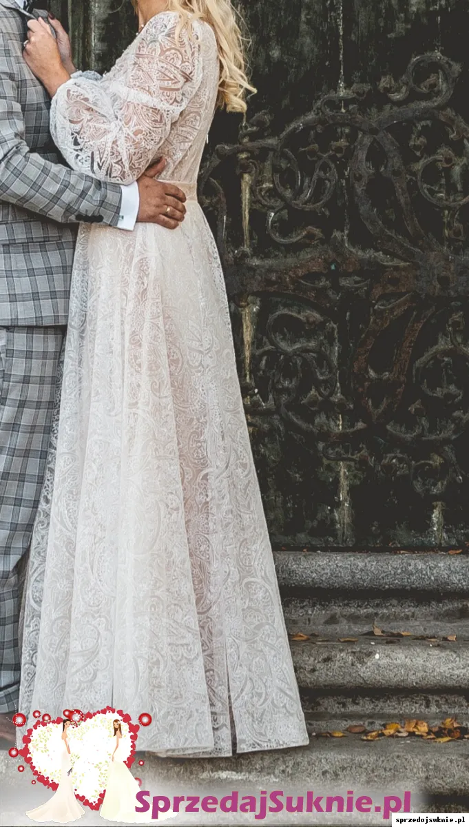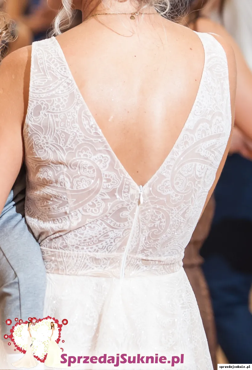 Sprzedam sukienkę ślubną szytą na miarę na 175cm, górna warstwa na dole jest popruta więc jest do przeróbki bądź przeszycia. Ma doczepiane rękawki. Jest z brokatem, ładnie się mieni