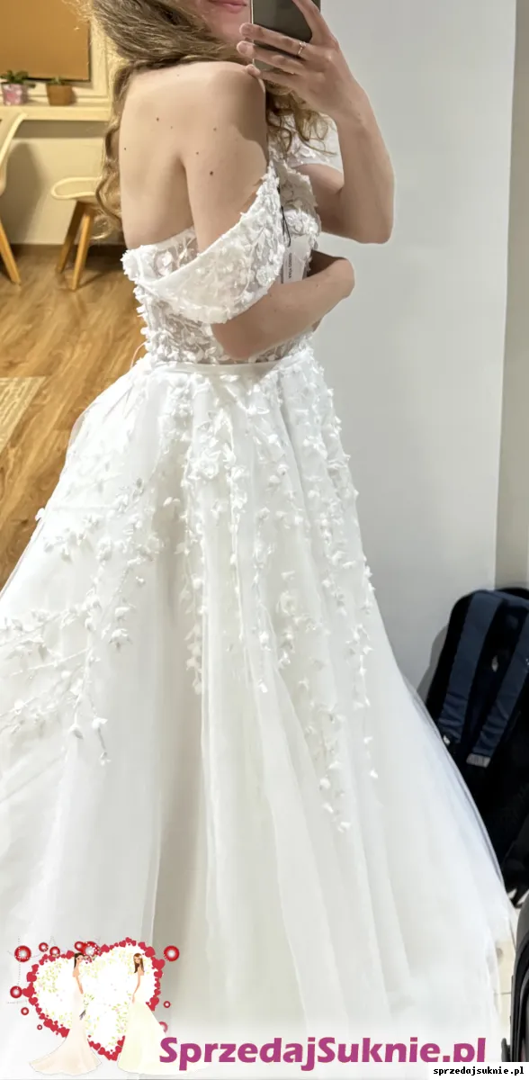 • Design: Piękne zdobienia 3D, opadające ramiączka i lekki, tiulowy dół.