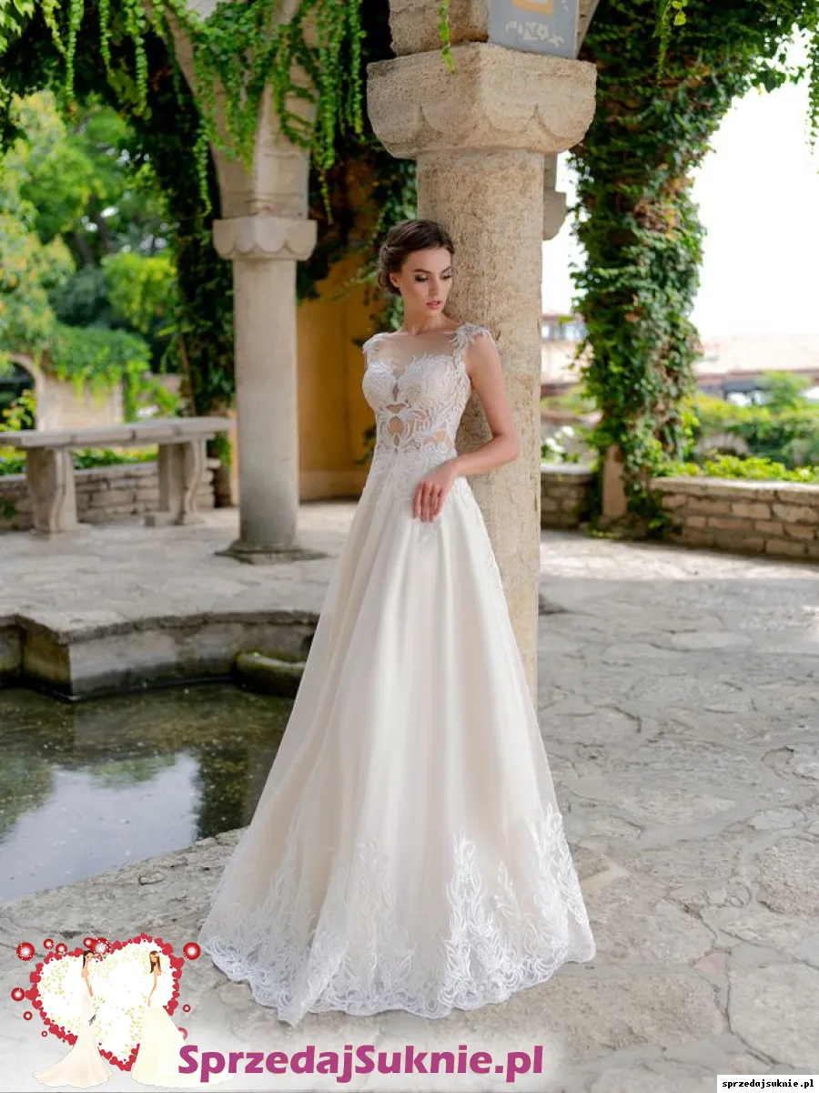 Sprzedam piękną suknię ślubną z hiszpańskiej kolekcji La Petra model Rosalino wraz z welonem (jak na zdjęciu) i halką na kole. Rozmiar 36, wzrost 162 cm + obcas 8 cm. Góra koronkowa na cielistej siateczce, kolor ivory, mieniąca się, dół sukni z miękkiego tiulu na podbiciu w kolorze toffi. Suknia po czyszczeniu, stan bardzo dobry, bardzo wygodna. Może być noszona również bez koła. Możliwe są przeróbki w salonie w Szczecinie, w którym suknia została zakupiona.