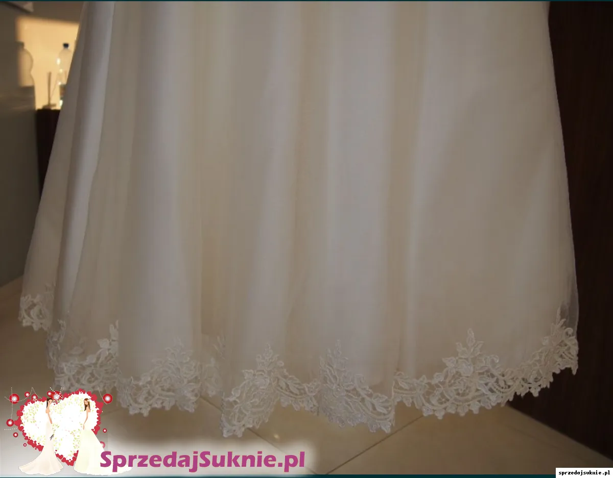 W kształcie litery A, spódnica z kołem (możliwe wyciągnięcie, jednak z założonym pięknie układa się w tańcu), obszyta koronką.