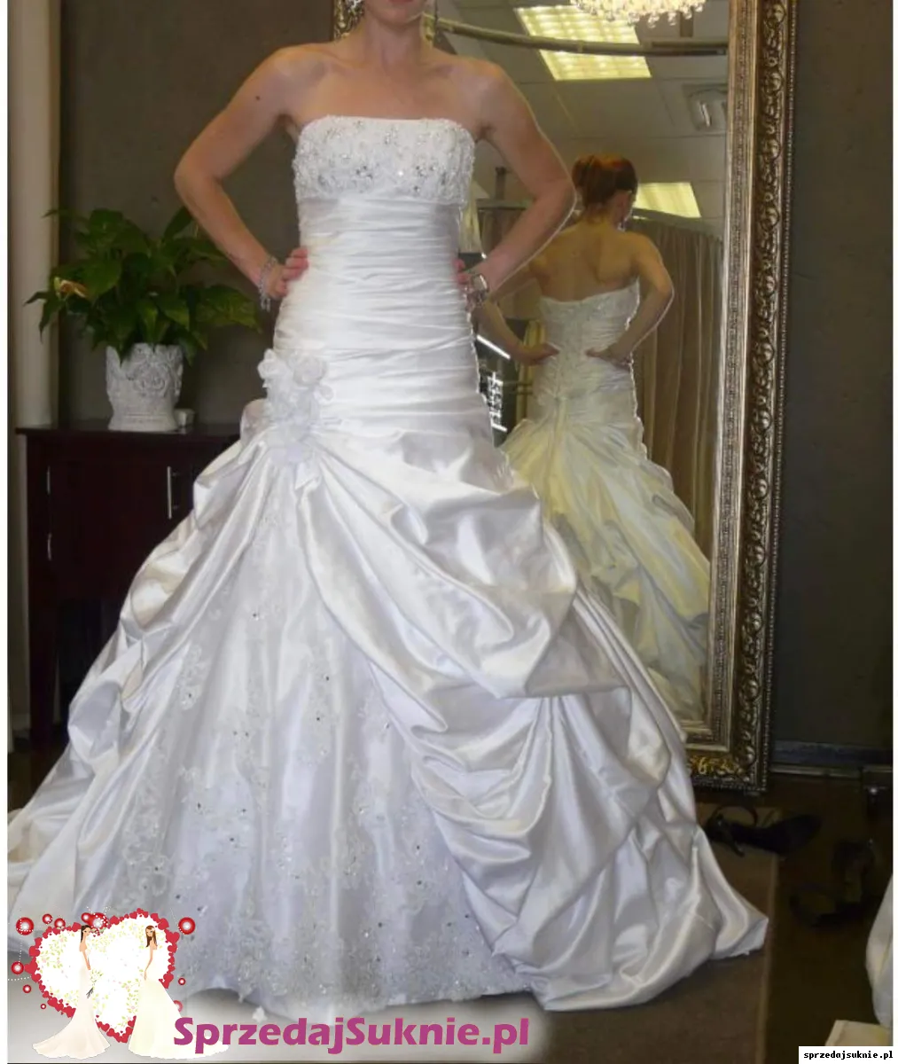 Suknia uszyta jest z miękkiej satyny, idealnie dopasowuje się do figury. Gorset podkreśla talię, oraz biodra. Lekkości dodaje koronka, z mieniącymi się kamieniami. Długi odpinany tren, nadaje szyku. Stan idealny. Zapakowana hermetyczne i wyczyszczona.