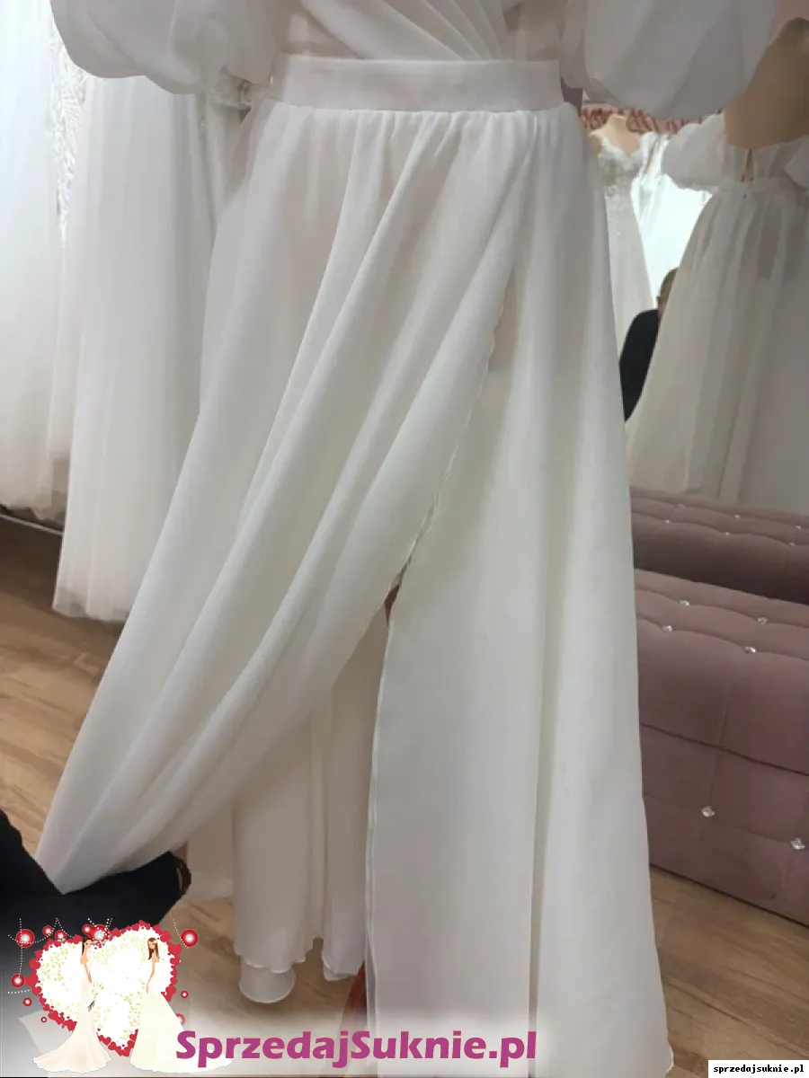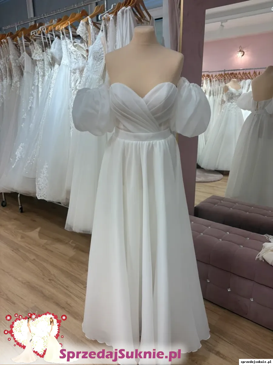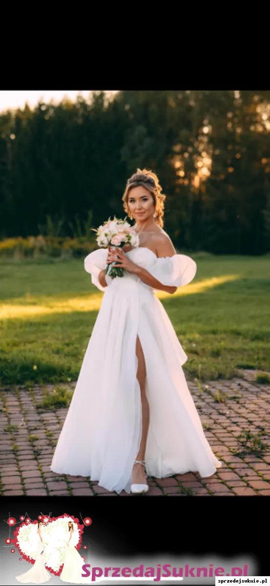 Mam na sprzedaż piękną, lekką klasyczną suknie ślubną z bufkami na gumkę oraz z doczepianymi ramiączkami. Suknia ma piękny rozporek. Suknia jest jak nowa. Czysta, pachnąca prosto z salonu czeka na przyszłą Pannę Młodą. Jeśli Panna Młoda będzie z Olsztyna lub okolic, to salon sukien ślubnych w Olsztynie zrobi poprawki :) Wymiary: Biust - 86 Talia - 68 Wzrost 168 + 6 cm obcas