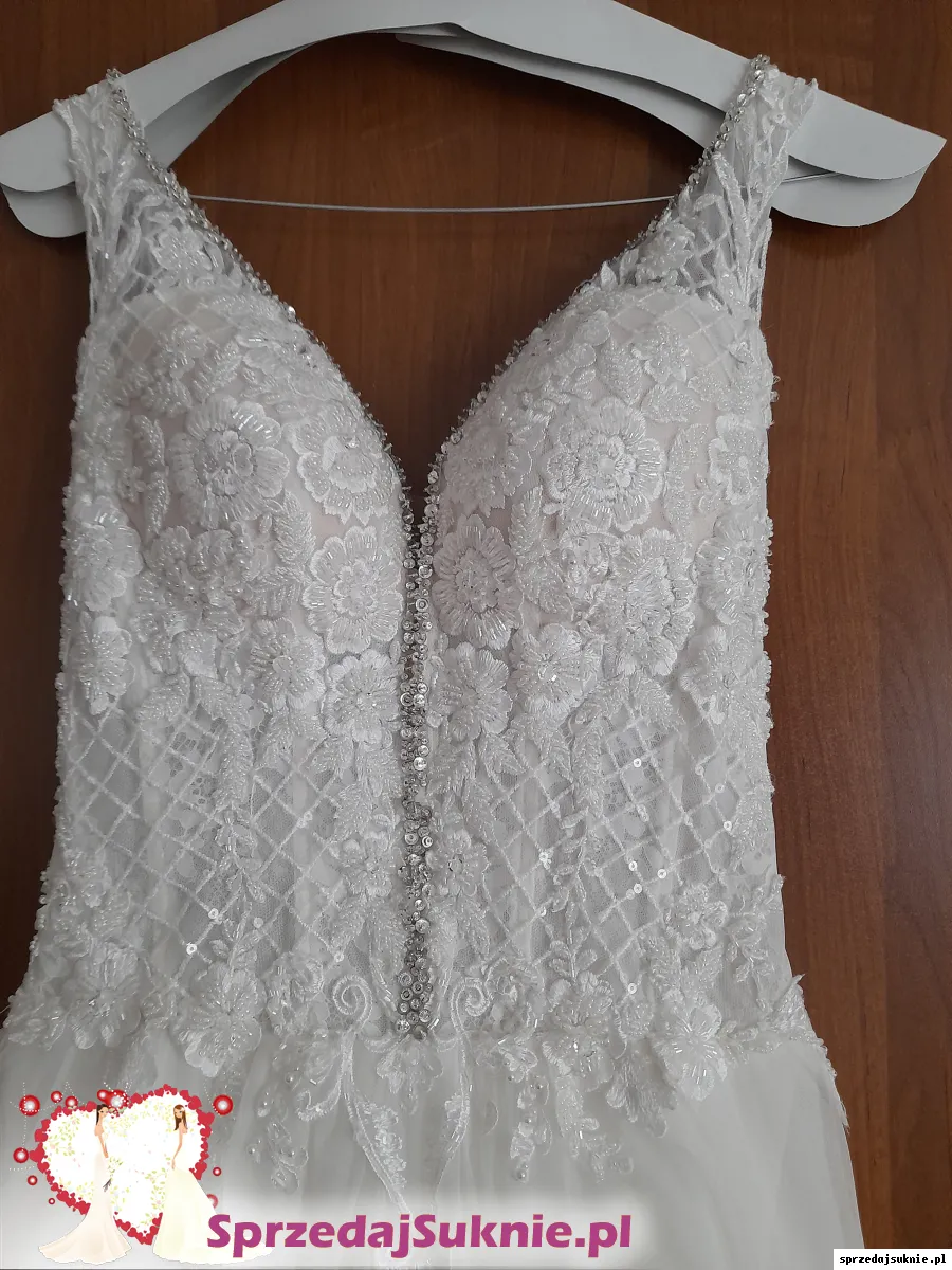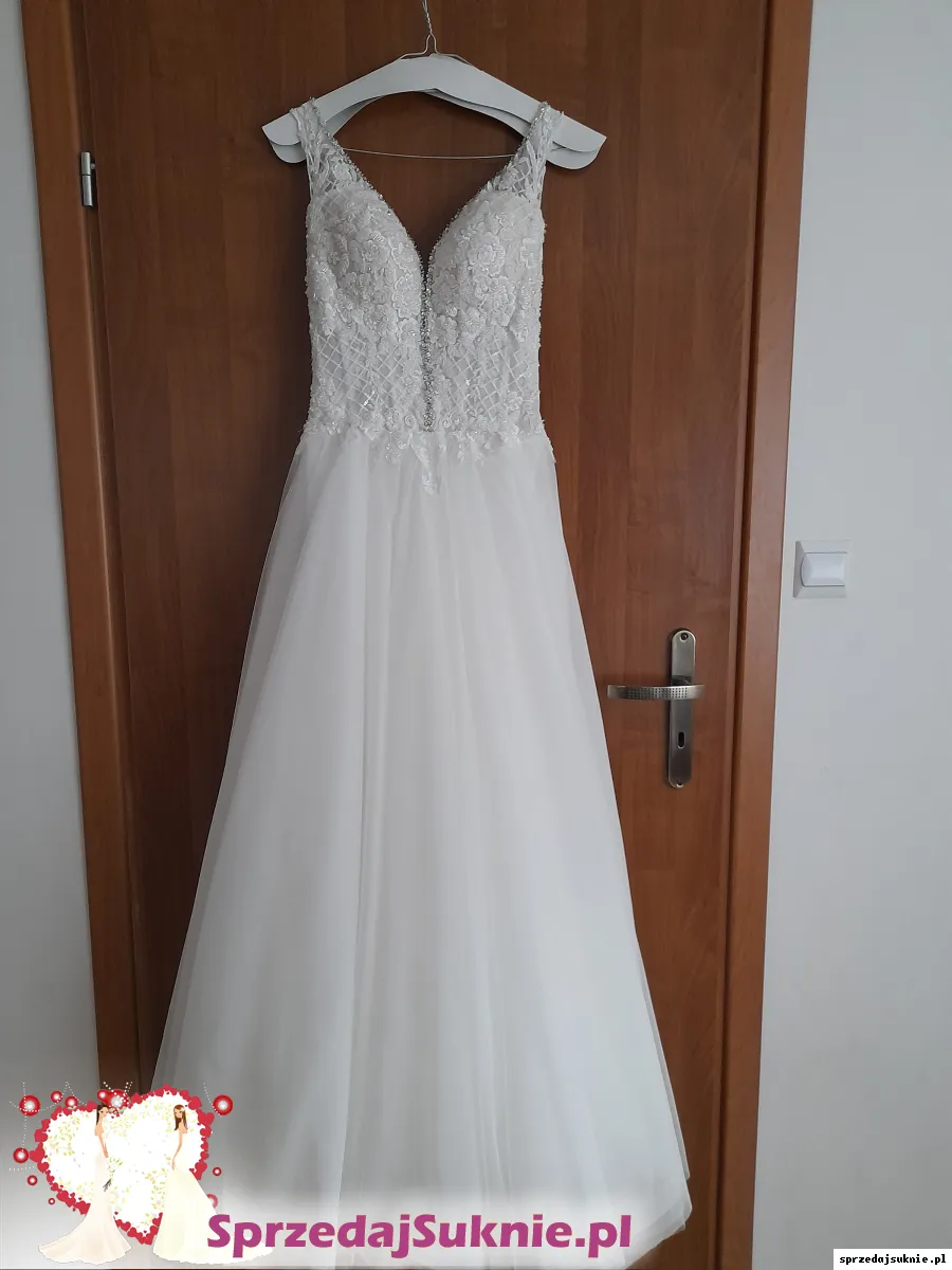 Sprzedam śliczną suknię ślubną, model Maxima 1119. Suknia ma bogato zdobiony gorset i piękny dekolt. Bardzo wygodna i lekka. Rozmiar 32/34. Suknia po praniu. W komplecie koło i długi 3 metrowy welon na grzebyku. Cena w salonie za samą suknię około 3000 zł. W razie pytań proszę o kontakt.