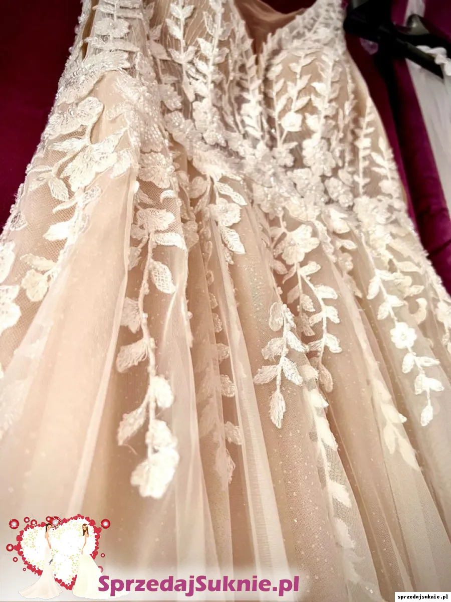 Suknia posiada 9 warstw- jedna z nich jest lekko brokatowa i beżowa, co dodaje sukni połyskującego efektu i oryginalnego koloru.