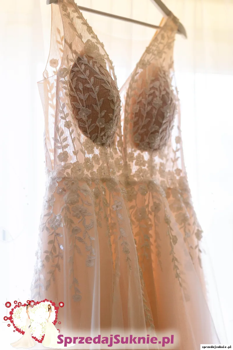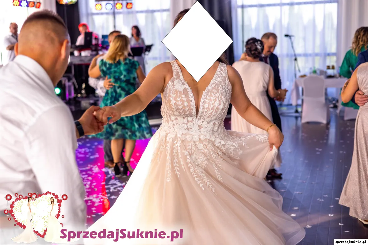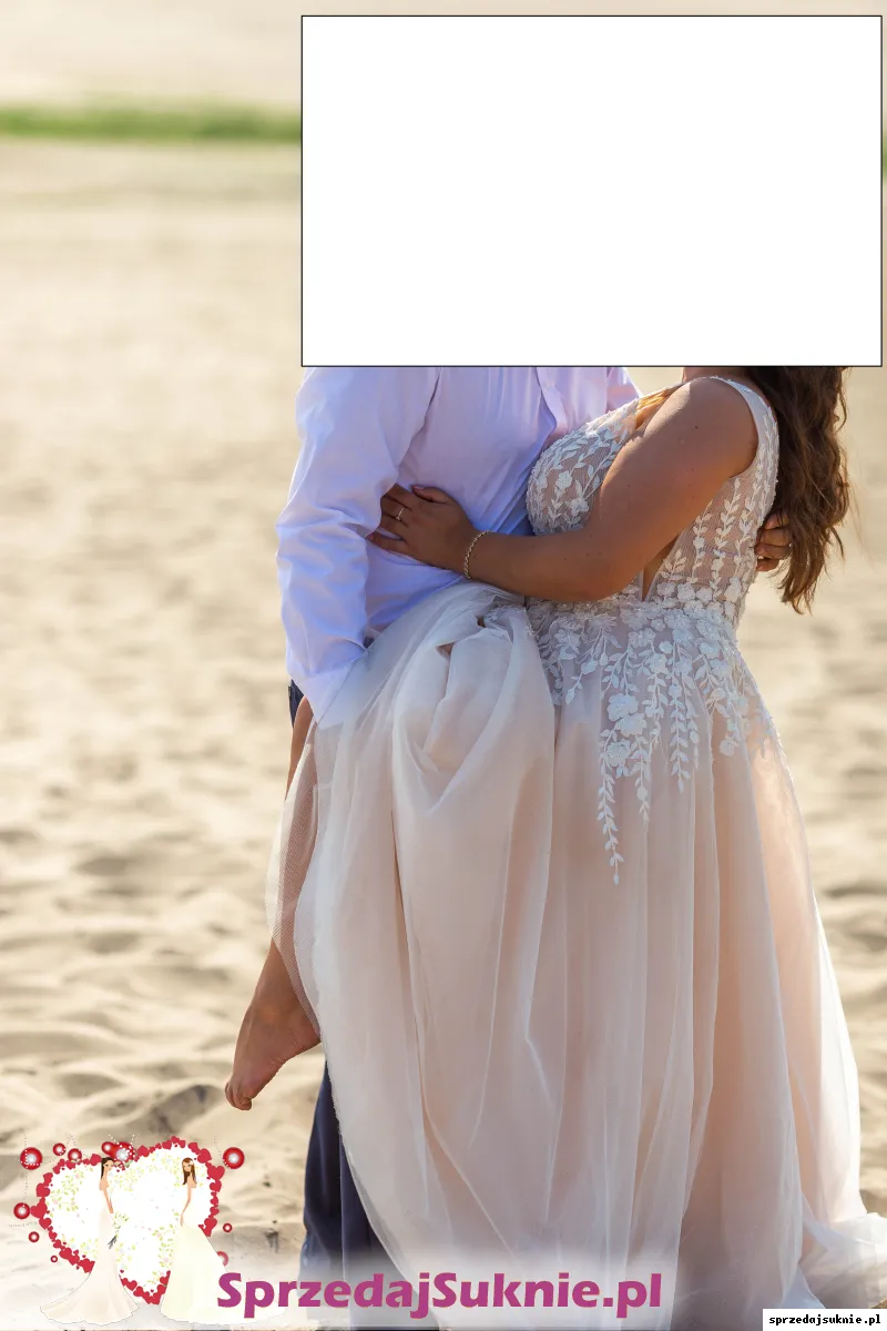 Sprzedam suknię ślubną - Maxima Jasmine zakupioną w salonie sukien ślubnych Gaja w Przemyślu. Sukienka z kolekcji 2022 - odebrana w lipcu 2022r. Sukienka jest w idealnym stanie. Szyta na rozmiar biustu 109cm, talia 90cm, wzrost 164 + 8 cm obcas. Bez problemu można skrócić czy zmniejszyć. Kolor sukni: u góry ecru, beż, dół brzoskwinia/morela, beż. Dół sukni mieni się ciepłymi drobinkami. Dodaje welon w kolorze sukni, dedykowany do tego modelu GRATIS! Jest bardzo lekka, pięknie się układa przez taśmę na dole sukni, robi niesamowitą talię i cudownie się kręci w tańcu. Gorąco polecam! PS.Pomarszczenie ciałowej siateczki na dekolcie wynikało z mojej rezygnacji z biustonosza dopiero w dniu ślubu i co za tym idzie braku możliwości poprawki krawieckiej, którą można zrobić bez problemu(jest to nadmiar siateczki). Suknia nadaje się w 100%dla kobiety nawet w zaawansowanej ciazy. Możliwość obejrzenia i przymiarki w Gorzycach (gm. Tryńcza, pow. Przeworsk) po wcześniejszym umówieniu.