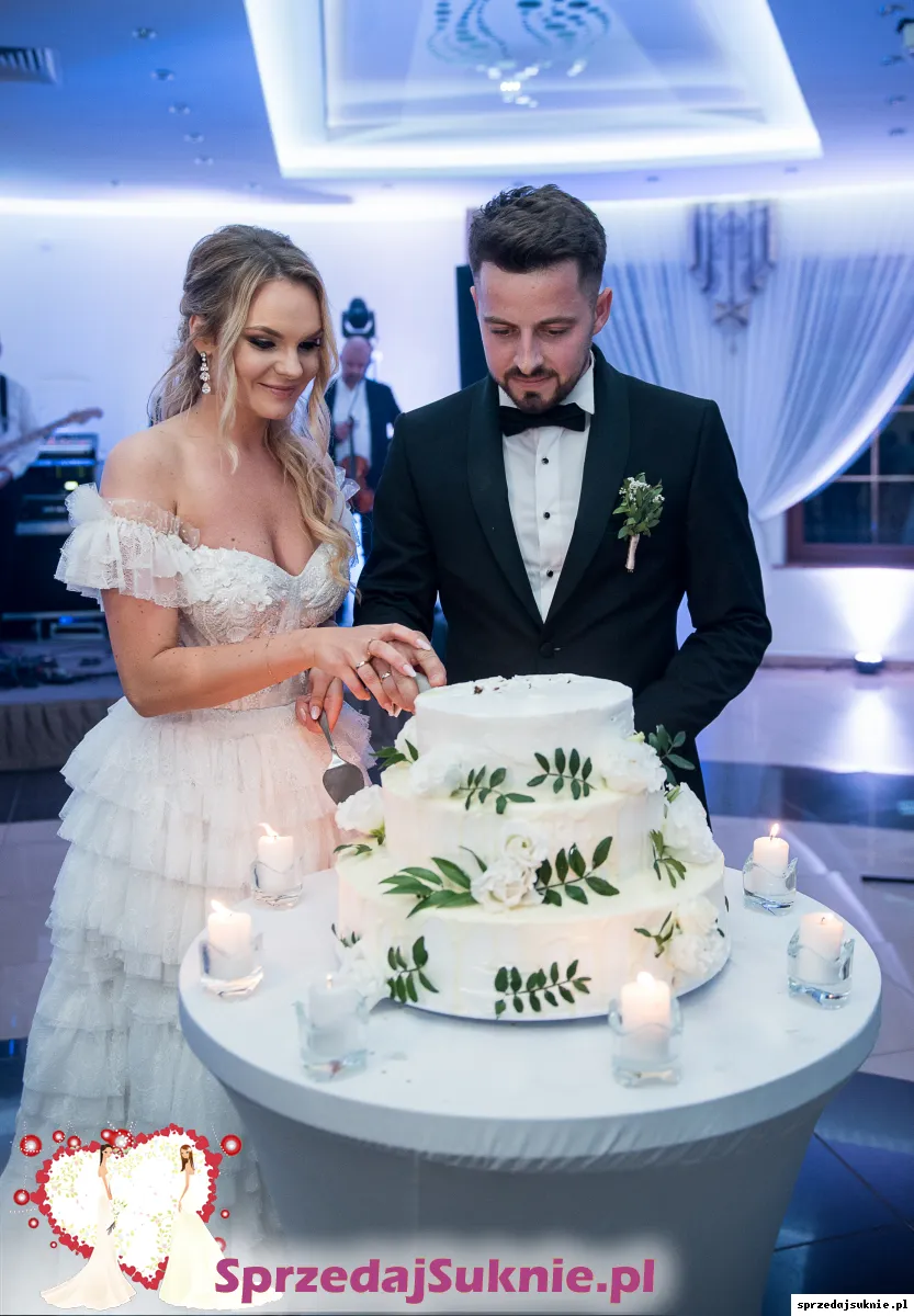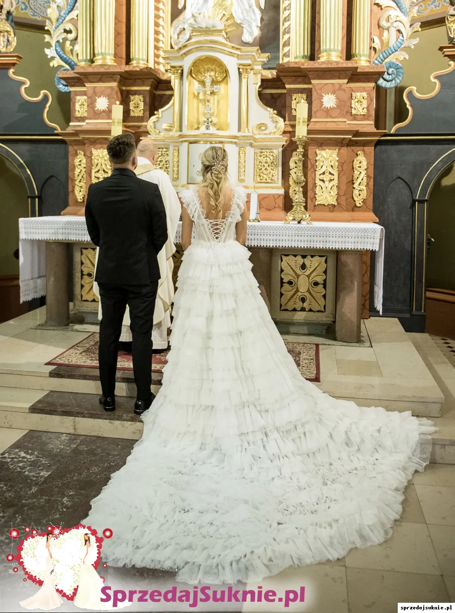 Dół sukni wykonany jest z wielu warstw delikatnych, koronkowych falban.