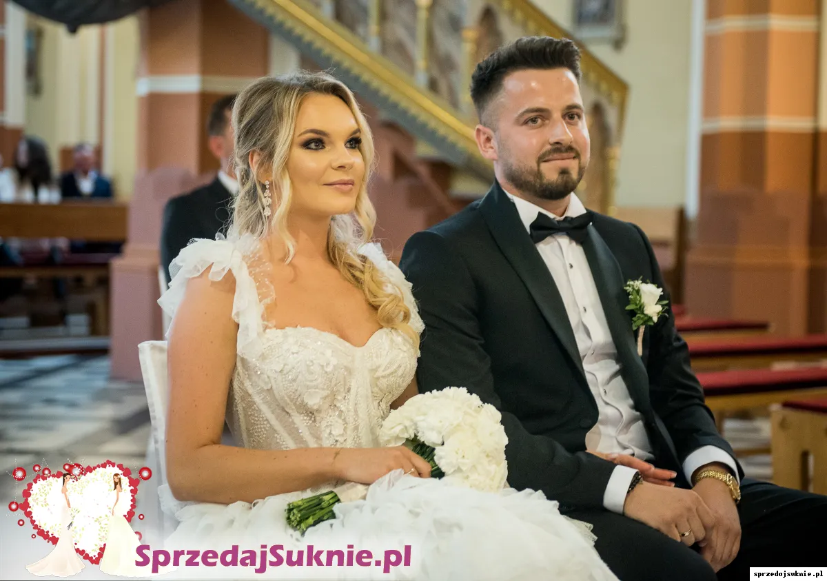 Kolor sukni to złamana biel w odcieniu pasującym zarówno do ciepłej jak i chłodnej karnacji.