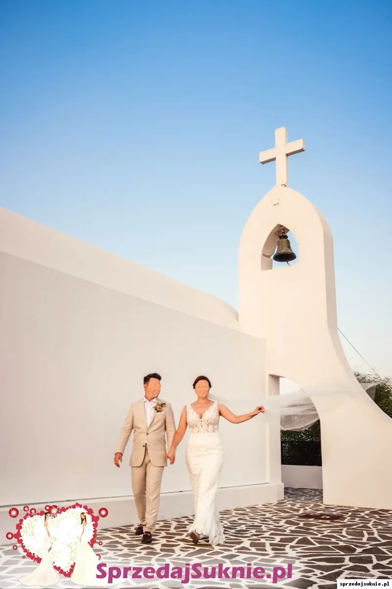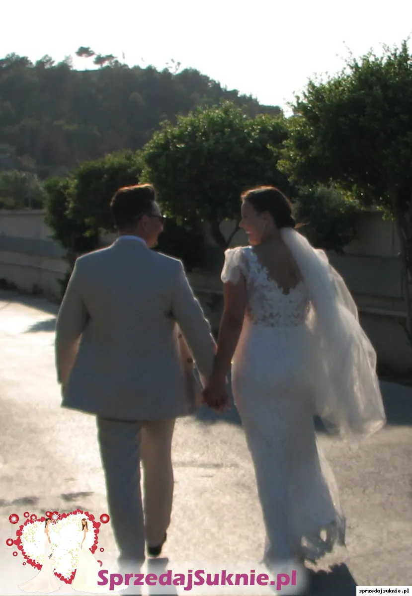 Do sukni dołączam długi welon. Suknia w kolorze écru/białym z przepiękną koronką, eleganckimi cekinami oraz koralikami.