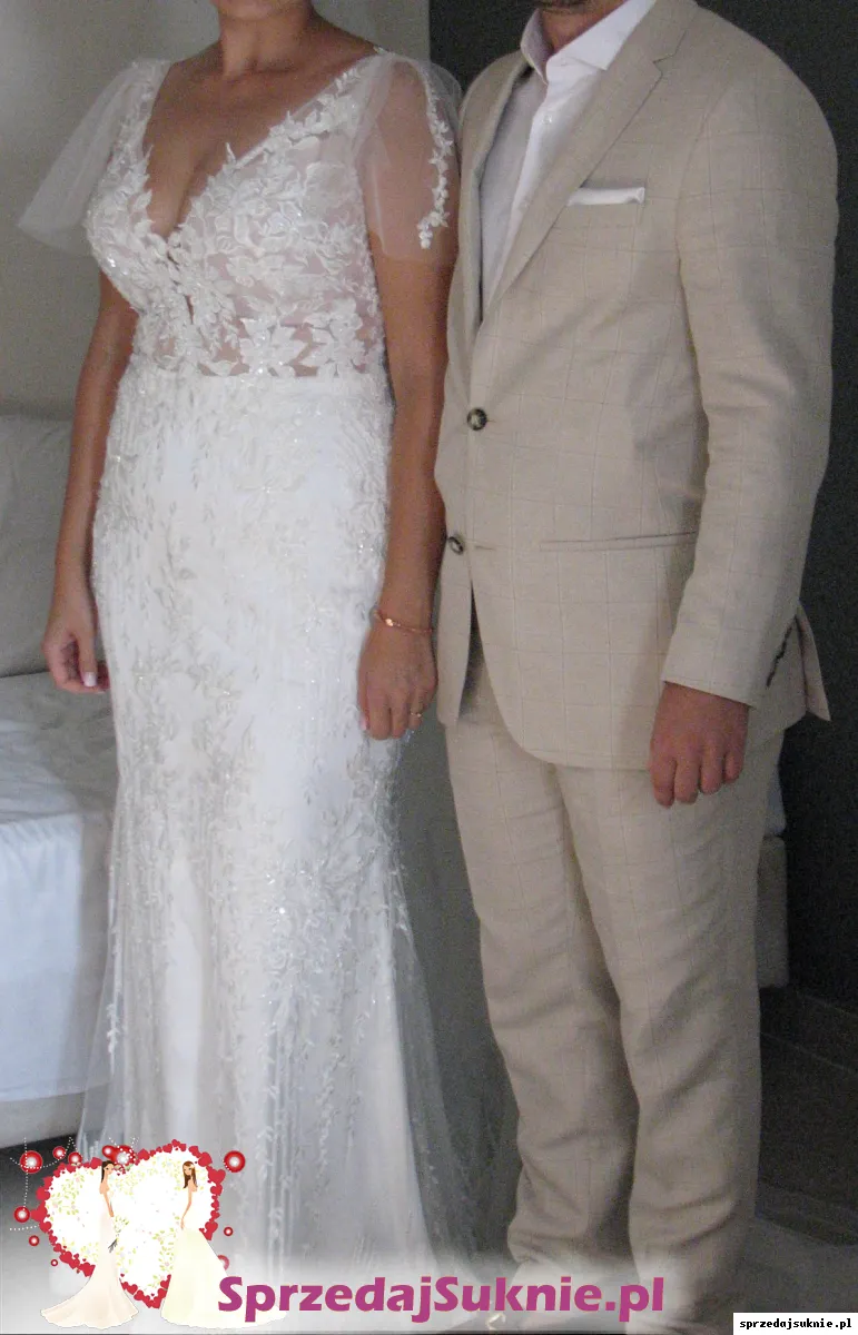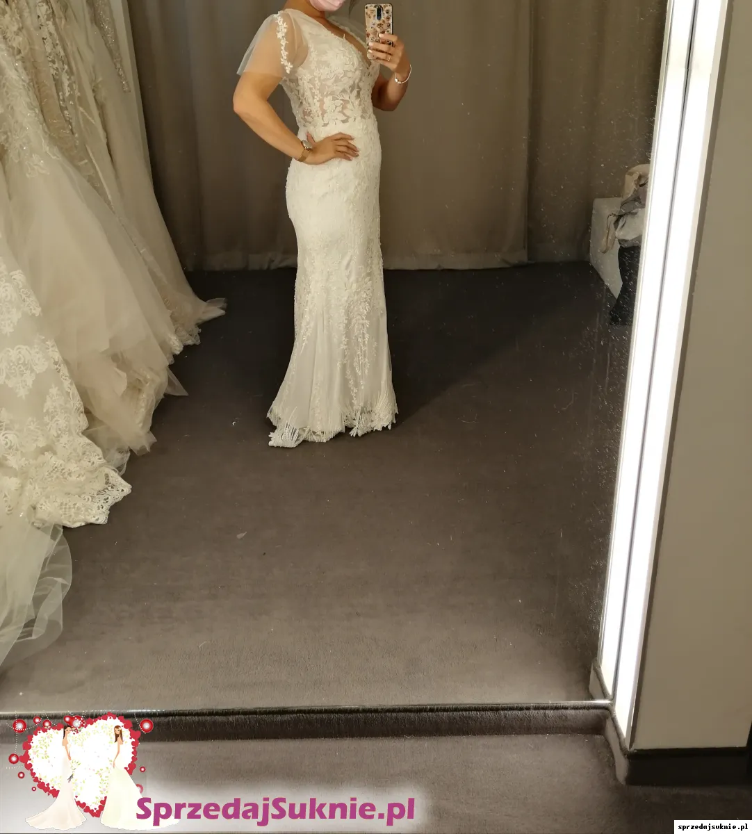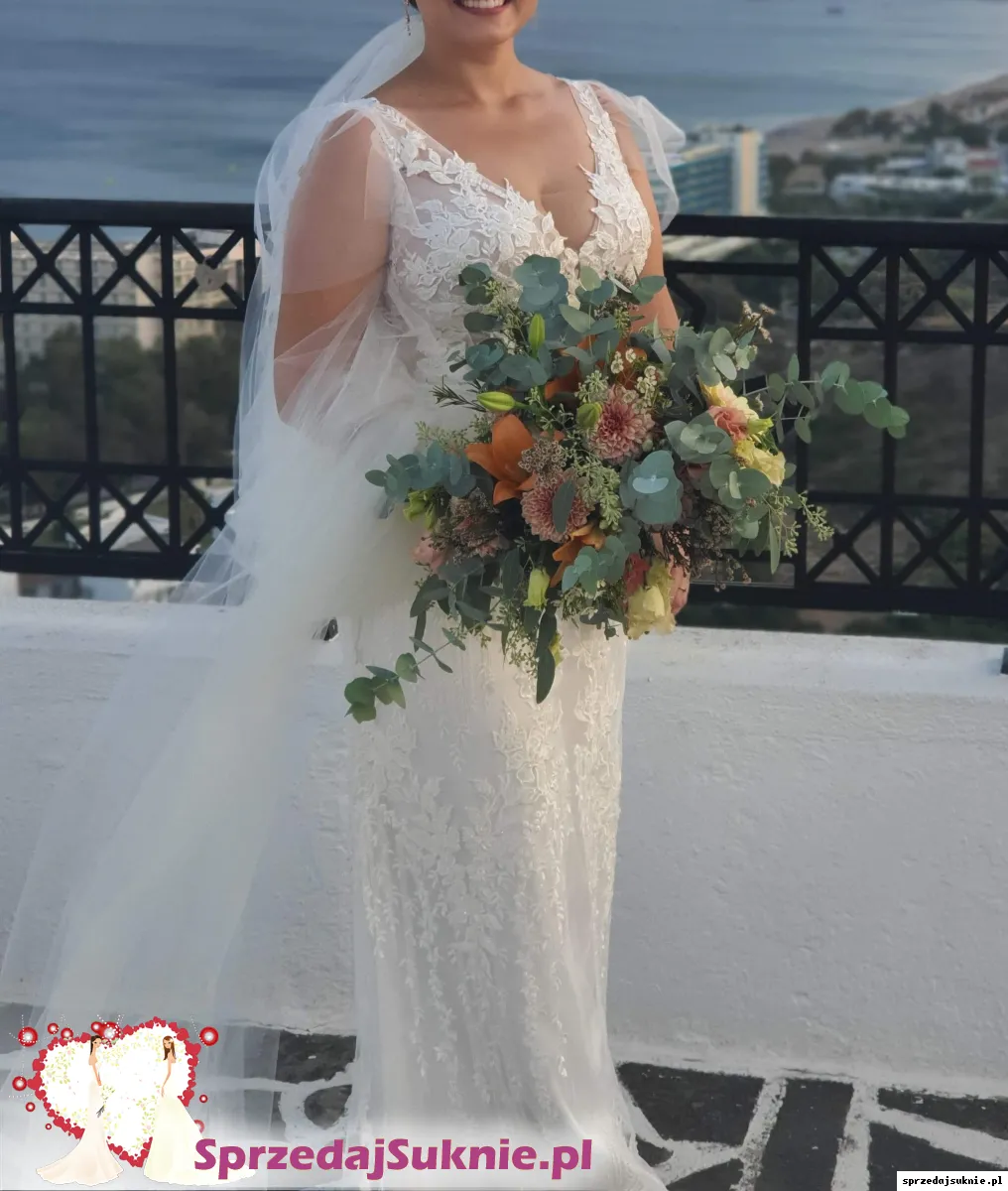 Suknia ma delikatny zwiewny rękaw, który został doszyty w salonie na moją prośbę z możliwością rozprucia i zostawienia sukni na ramiączkach w wersji oryginalnej.