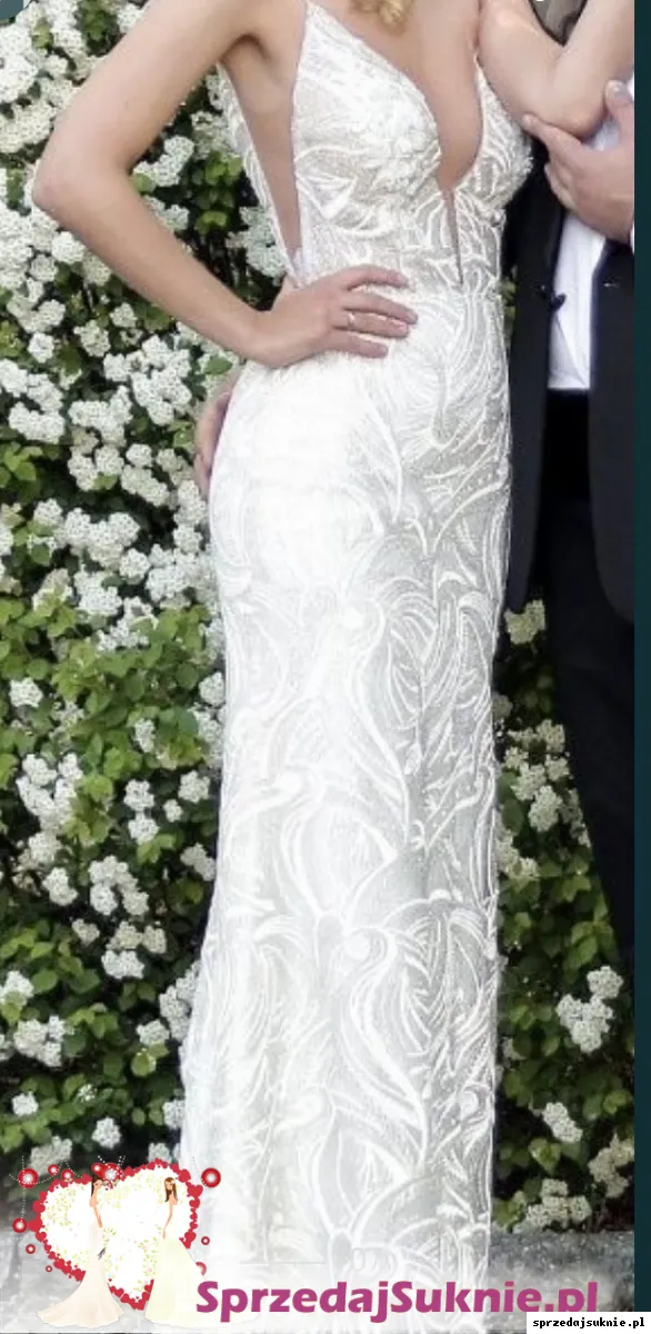 Mam do sprzedaży suknię ślubną z kolekcji Milla Nova model Rina. Suknia to rybka z głębokim dekoltem i wyciętymi plecami . Suknia uszyta na wymiary 90-68-102 na wzrost 170 cm + 7cm obcas.Jest to typowy glamour, błysk, cekiny. Efekt wow murowany! Super układa się w ruchu. W sukni zostały wszyte miseczki w rozmiarze C i fiszbiny, które dodatkowo modelują talię, ale bez problemu można także je wypruć.