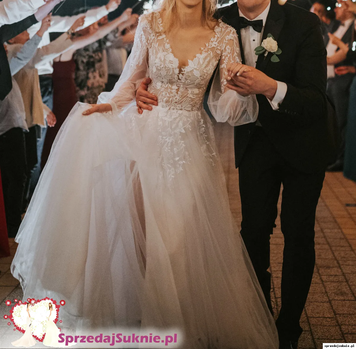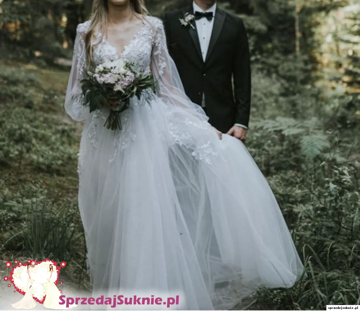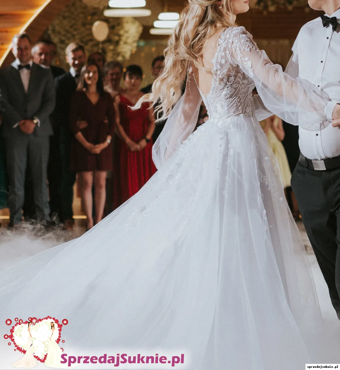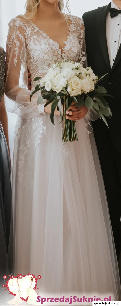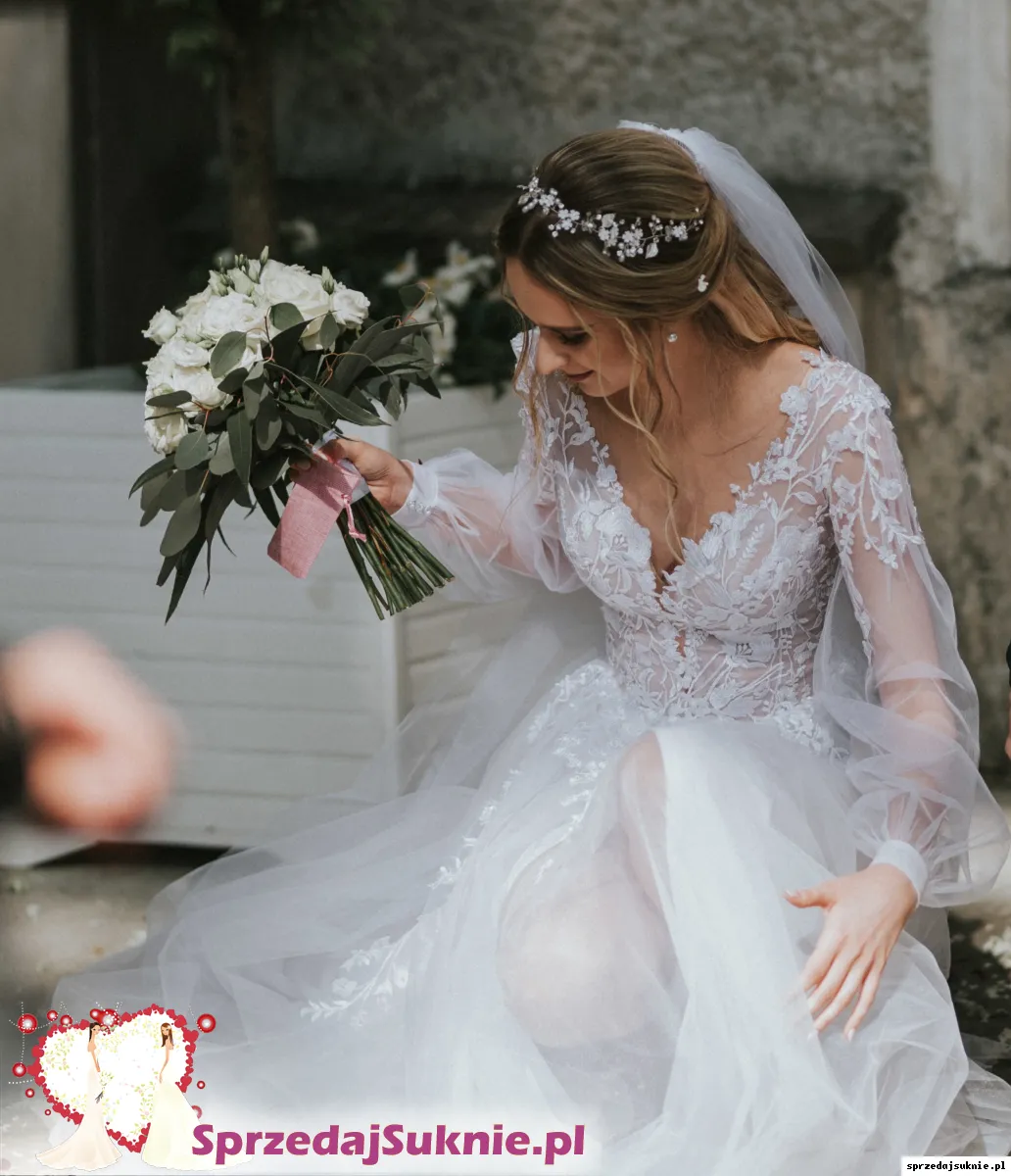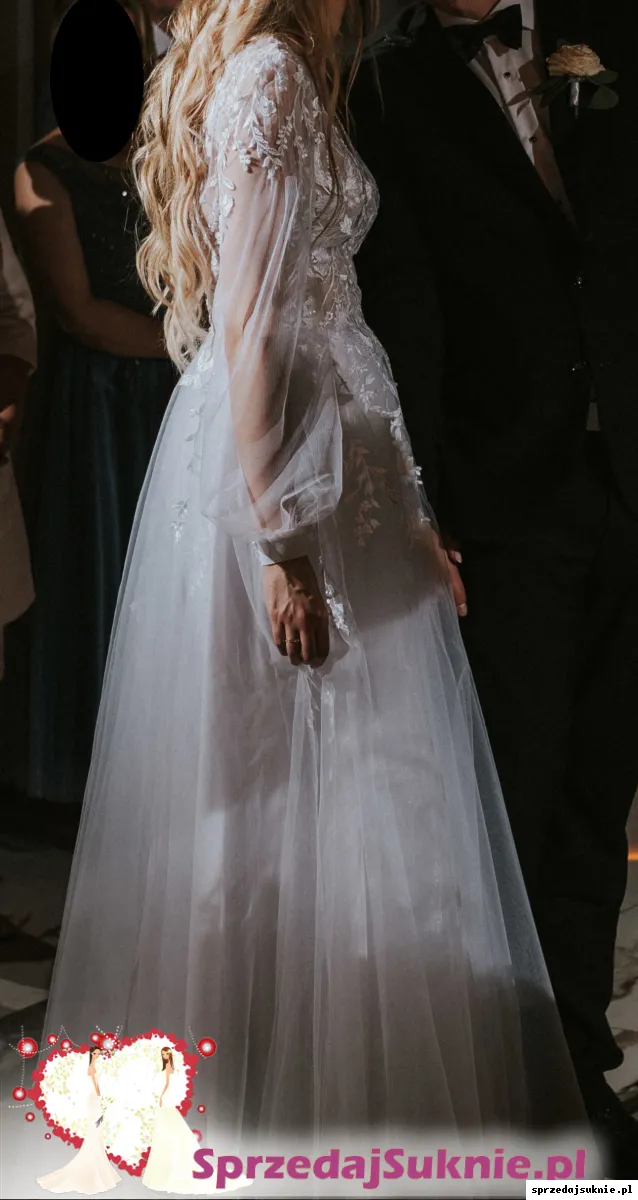 Suknia ma podwójną podszewkę z rozcięciem na nogę, dwie warstwy tiulu. Z tyłu zapinana na guziczki i niewidoczny zamek. Rękawy zapinane na trzy guziki. Na tiulu można znaleźć niewielkie dziurki, niewidoczne gołym okiem. U dołu jest niewielka plama po zaczepieniu o coś. Do sukienki dorzucę welon 160cm. Sukienka pięknie się układa w tańcu, jest mocno marszczona, nie ma trenu. Bez problemu można ją skrócić. Zapraszam do przymierzenia na terenie Krakowa.