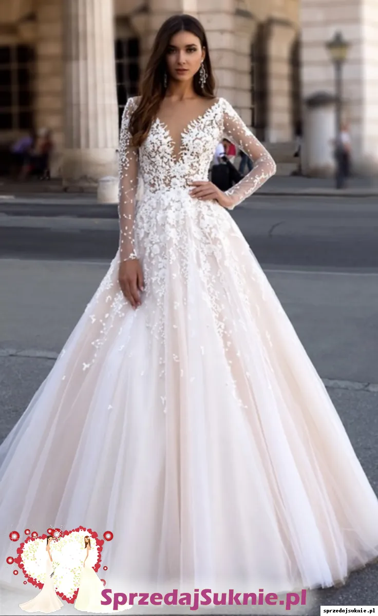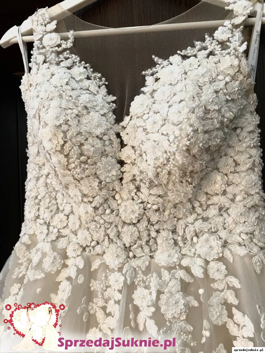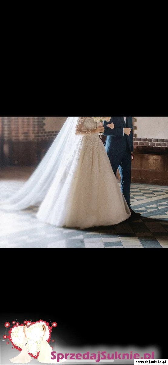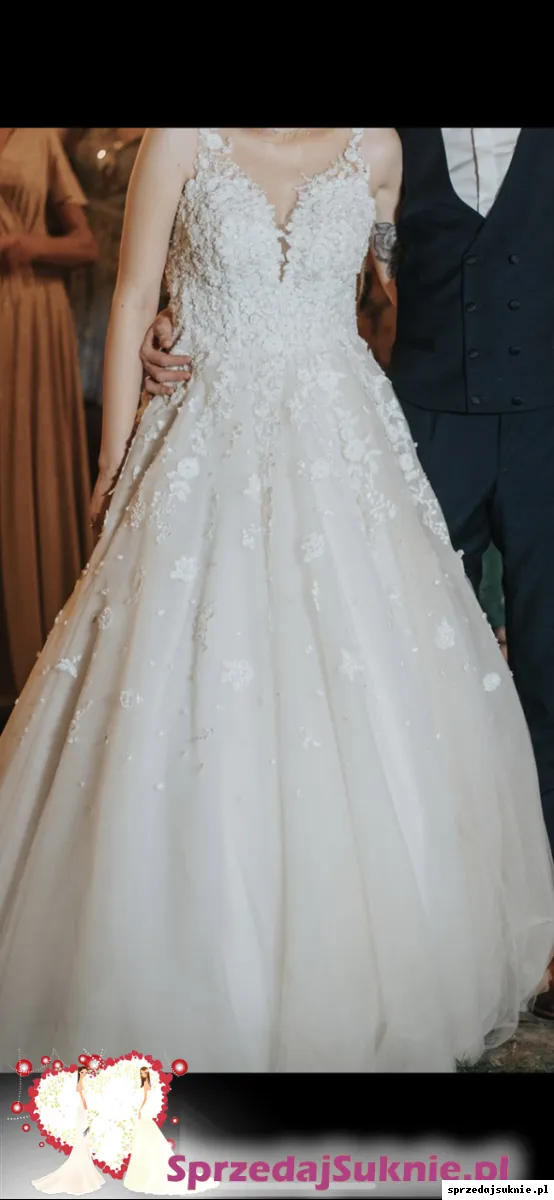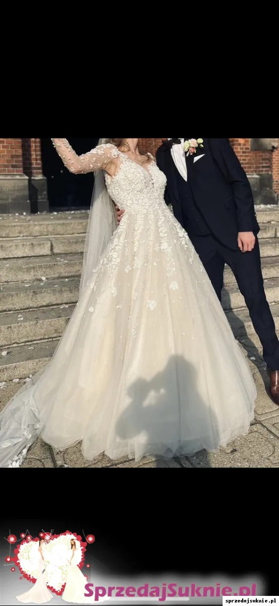Sprzedam suknie ślubną. Suknia jest jak nowa wyprana w pralni chemicznej. Kolor tiulu pod spodem to lekkie ivory. Do sukni dodane jest koło na halce dzięki temu dół pięknie się układa. Rękawy są odpinane. Miseczki są przyszyte oraz gorset. Ogólnie suknie można zmodyfikować. Jest szyta na 174 cm wzrostu. Mogę dodać welon katedralny 300cm z perłami i kwiatami 3d takimi jak na sukni. Suknia w salonie kosztowała 6000 zł. Suknie można przymierzyć w Ząbkach k. Warszawy.