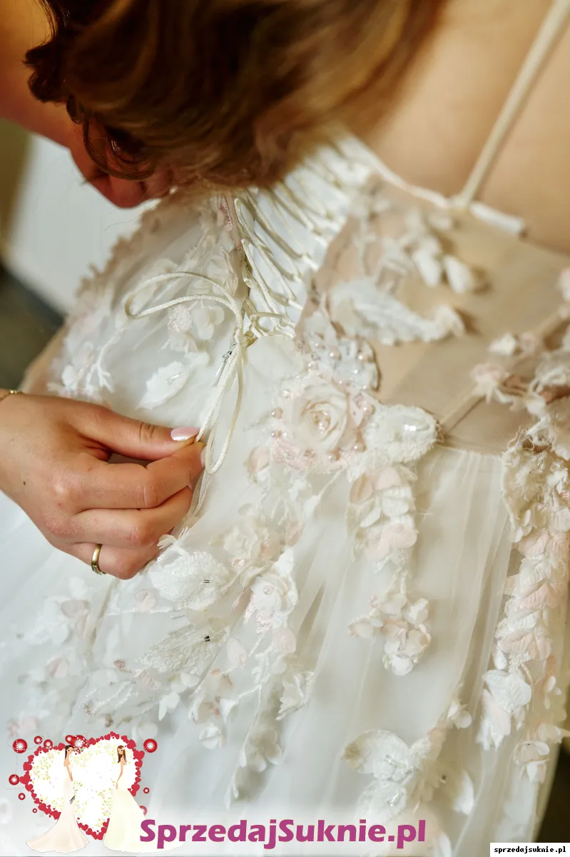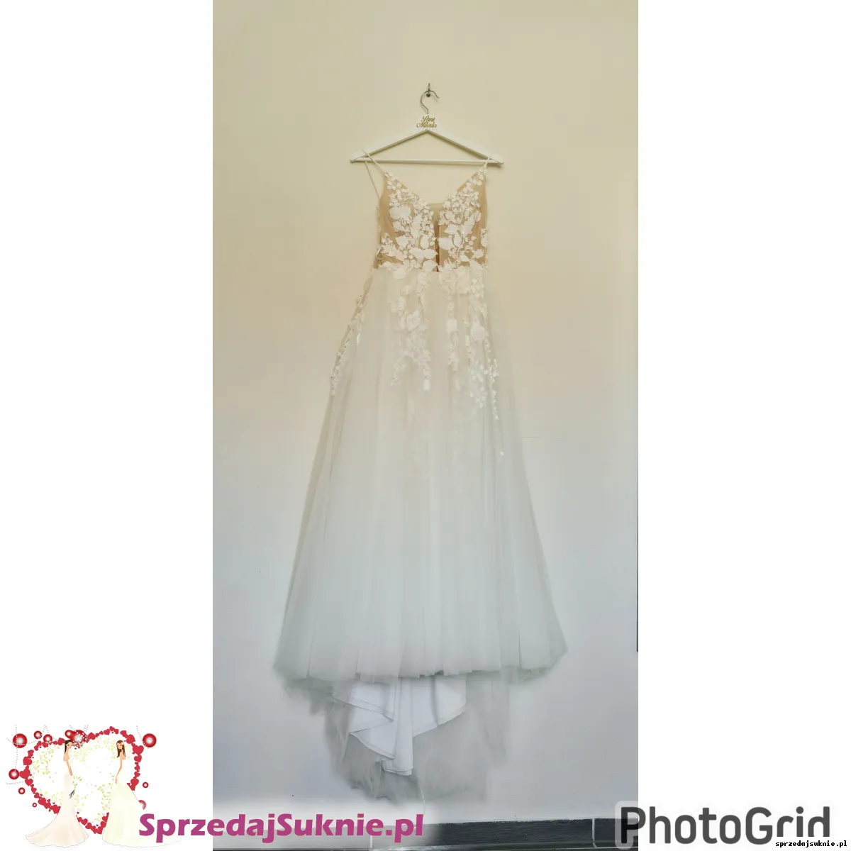 Sprzedam suknię ślubną Papilio 2024. Rozmiar 36/38 przerobiona na wiązany gorset przez co fajnie dopasowuje się do ciała . Bardzo Lekka i wygodna, nie plącze się podczas chodzenia ani w tańcu. Suknia z podpinanym trenem i rozcięciem na nogę. Dodaję do niej welon i rękawki na gumce, które super dopełniają stylizację.