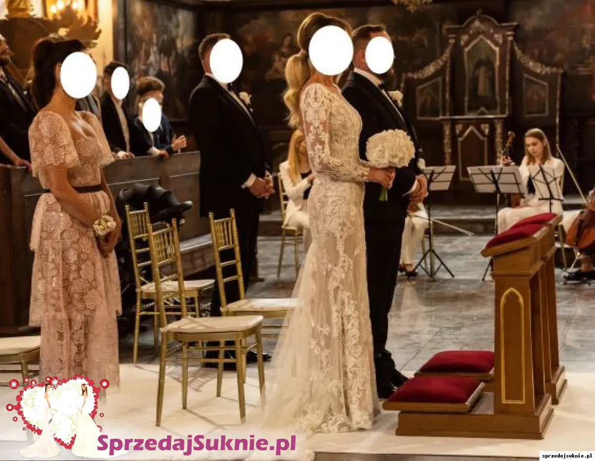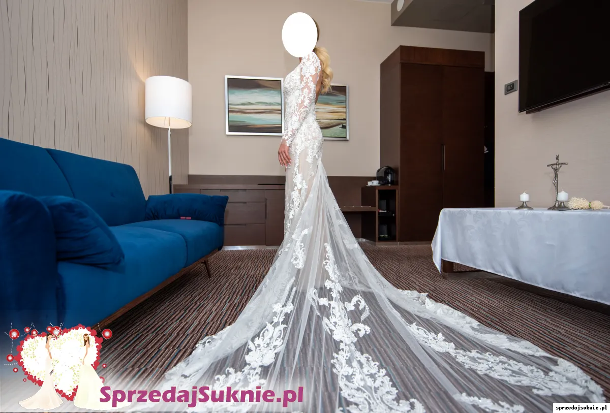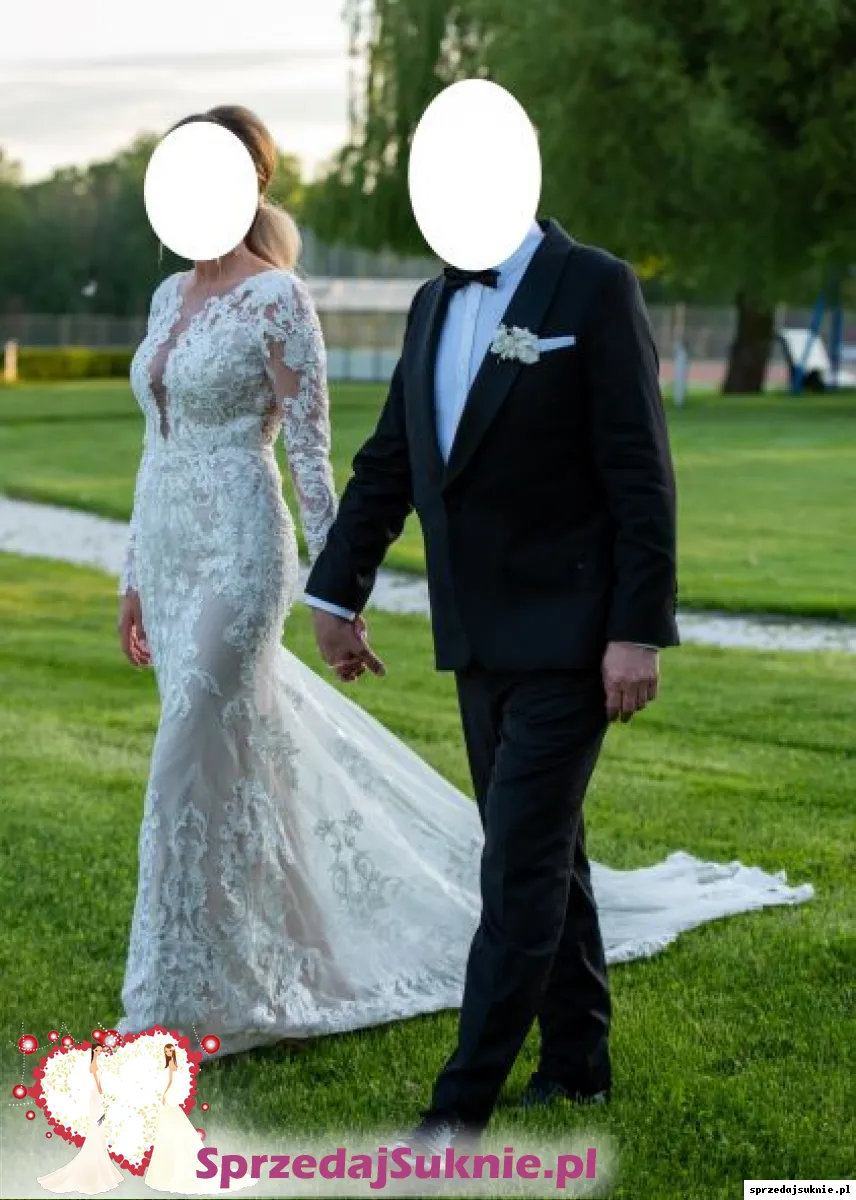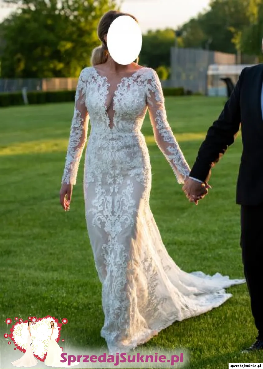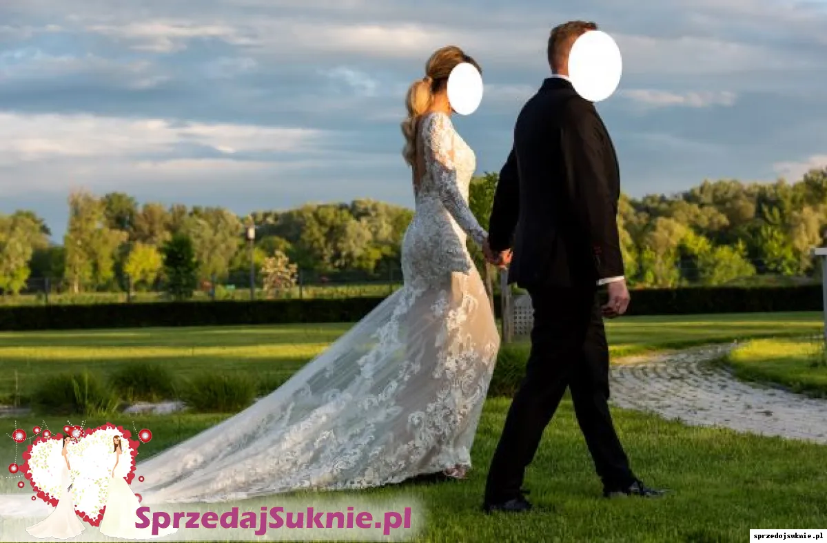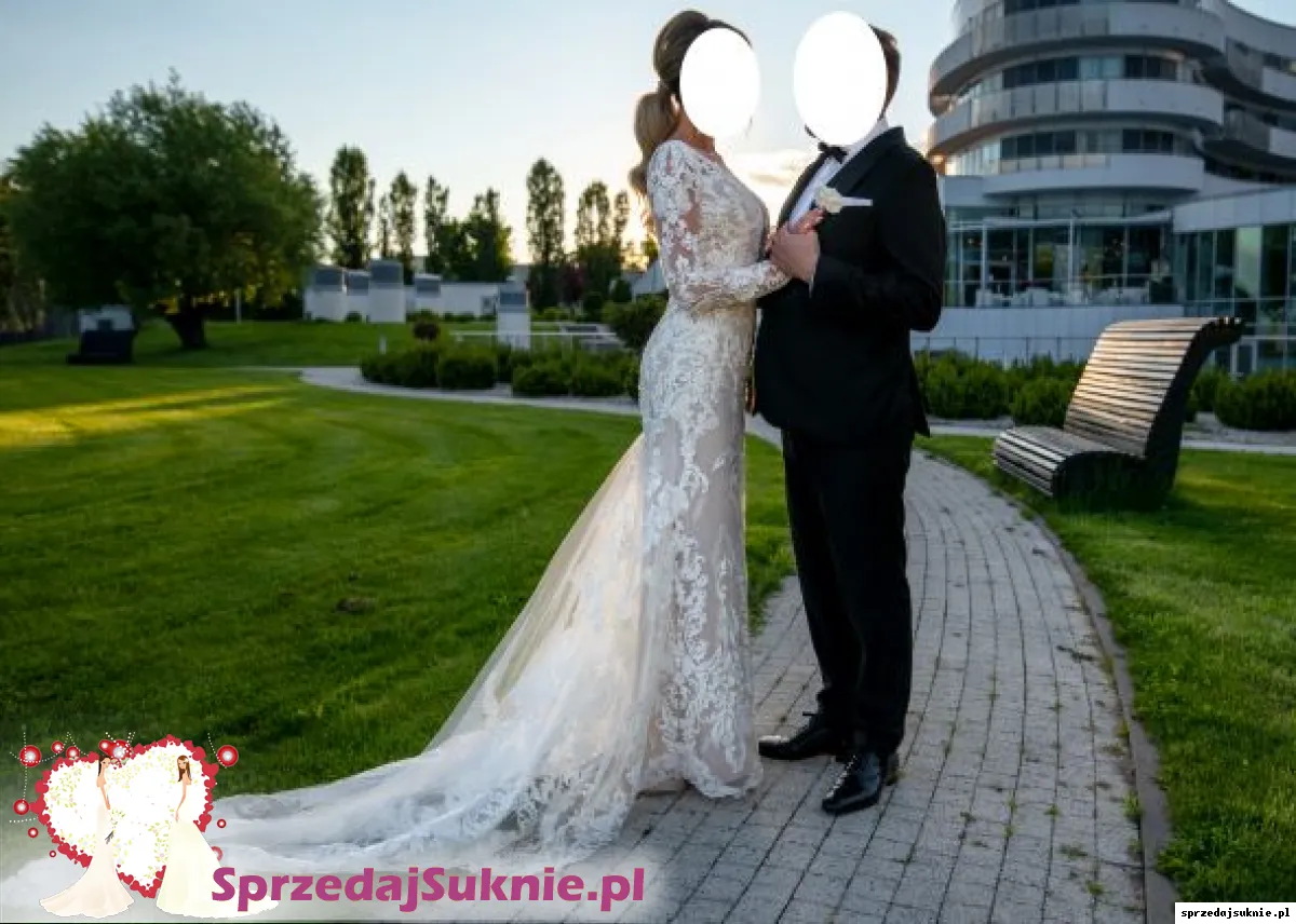Obłędna suknia otulająca ciało w zapierający dech w piersiach, półprzezroczysty haftowany tiul od góry do samego dołu. Dopasowany gorset podkreślający plecy i szyję, a także spektakularny tren królewski wykończony misterną koronką. Suknię dodatkowo przenikają delikatne kamienie Svaroskiego powodując jej szlachetne i delikatne mienienie się w słońcu, czy sztucznym świetle. Cena w Pronovias 16.700 zł i naprawdę warta swojej ceny! Stan idealny, wyczyszczona i przygotowana do sprzedaży w salonie Pronovias w Warszawie.