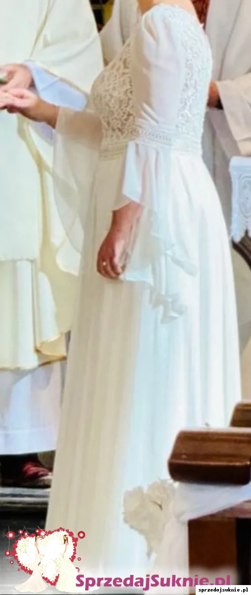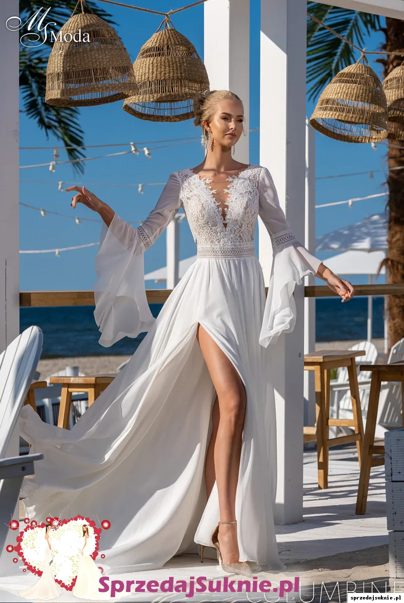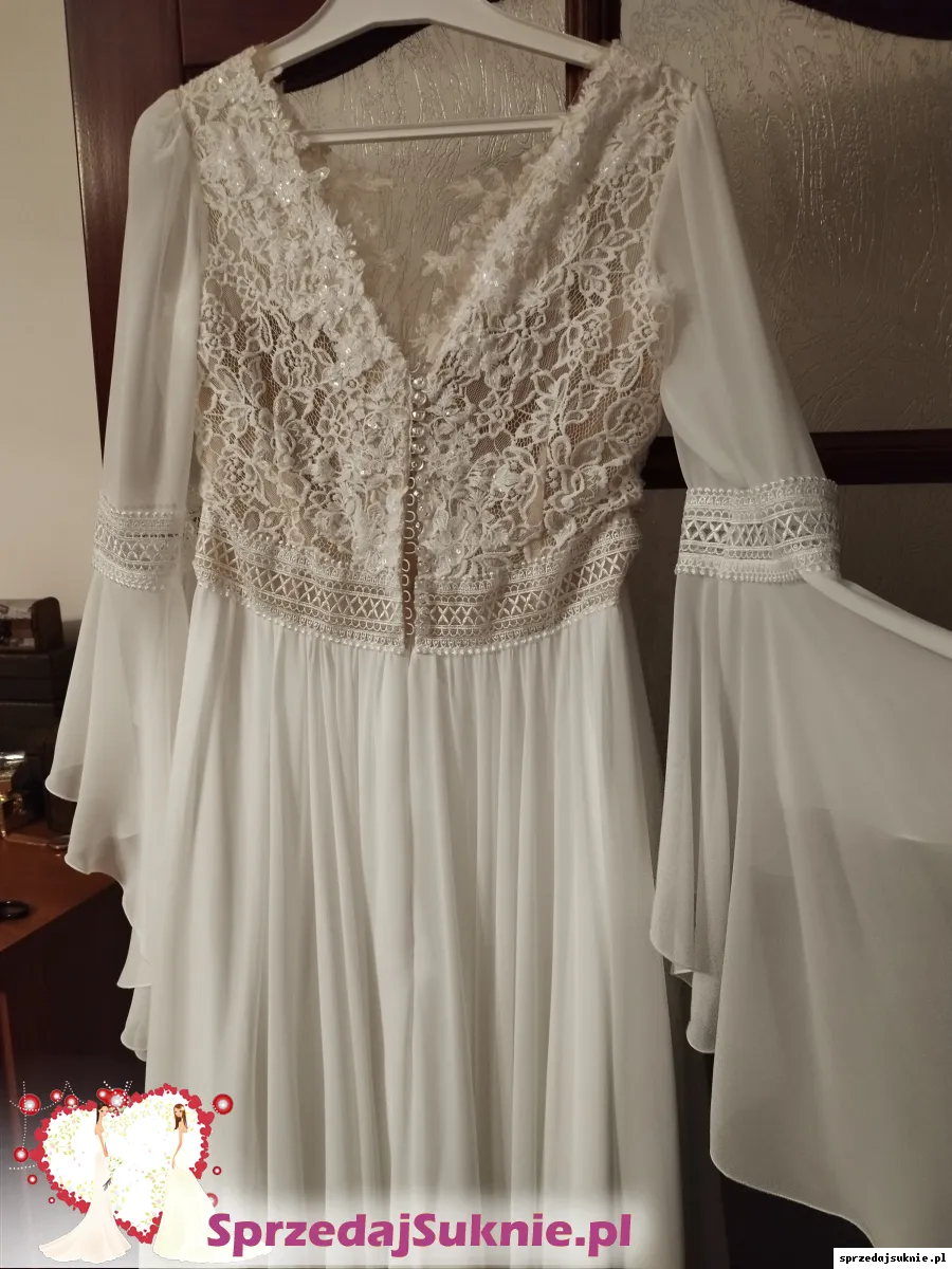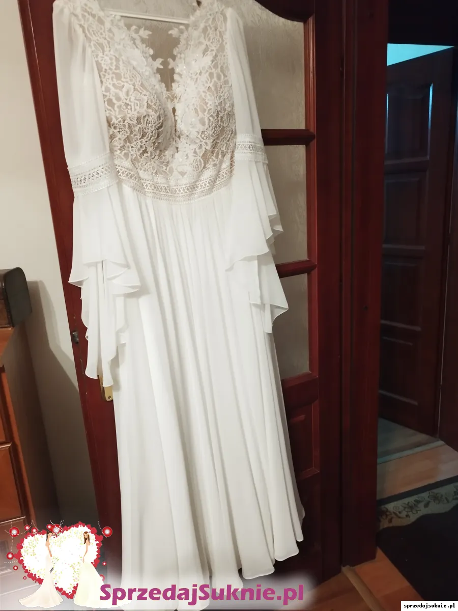 Sprzedam suknię ślubną w stylu Boho z długimi, rękawami. Suknia Columbina wyróżnia się lekką muślinową spódnicą, która nadaje kreacji delikatności i lekkości. Koronka w stylu Boho, która zdobi suknię, dodaje jej romantycznego charakteru i przywodzi na myśl sielski, leśny klimat. Romantyczne poszerzane rękawy i głęboki dekolt nadają sukni elegancji i subtelności, tworząc efektowny i kobiecy obraz. .