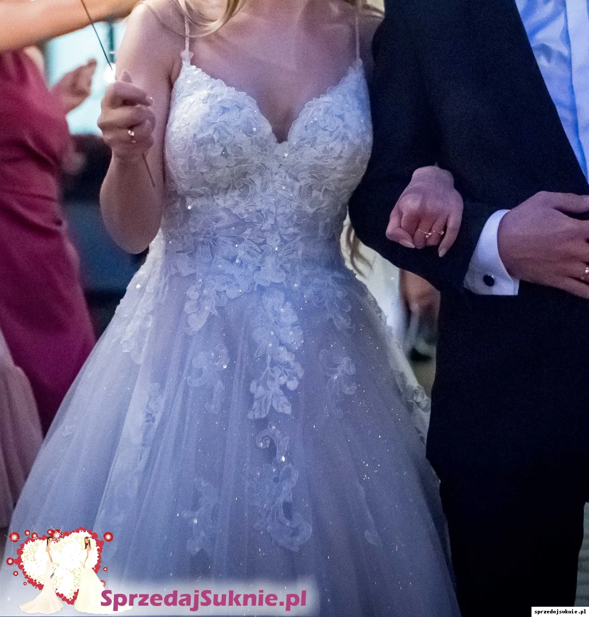 Suknia pięknie układa się w tańcu. Błyszczy w świetle dziennym i sztucznym. Jest bardzo wygodna. Tył sukni jest trochę zniszczony (podarty tiul przy taśmie).