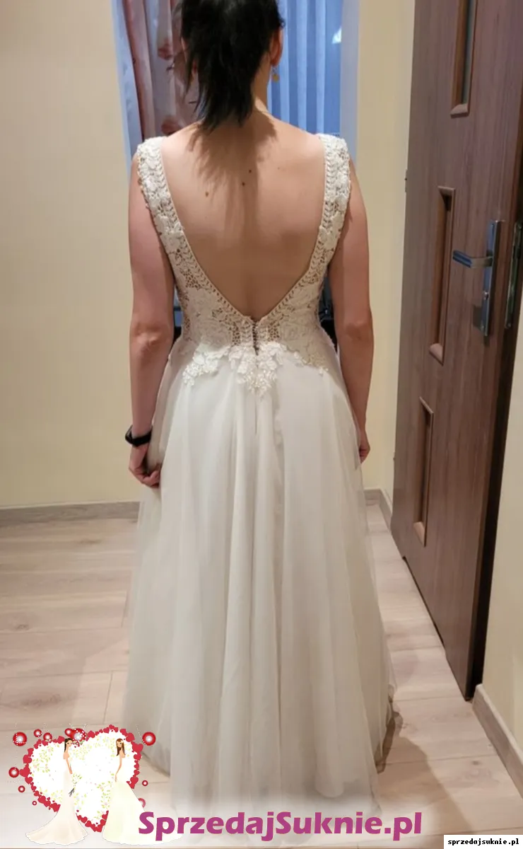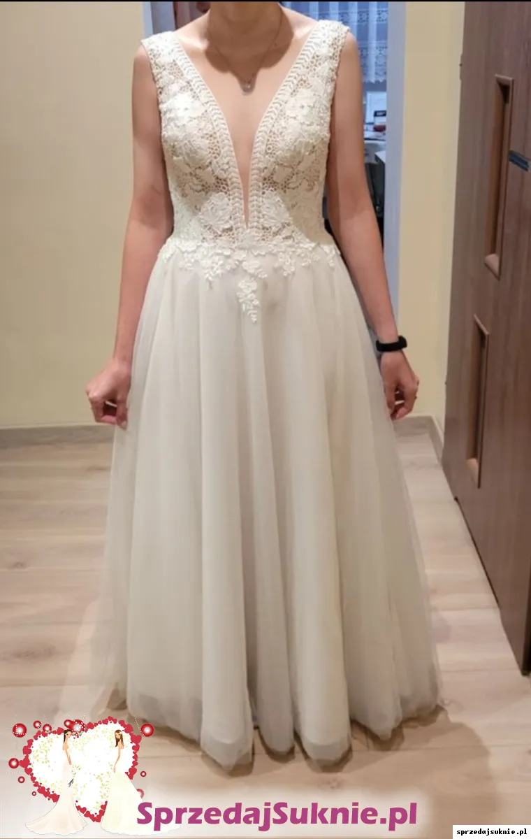 Sprzedam suknię kolor ivory z piękną koronką z głębokim dokoldem