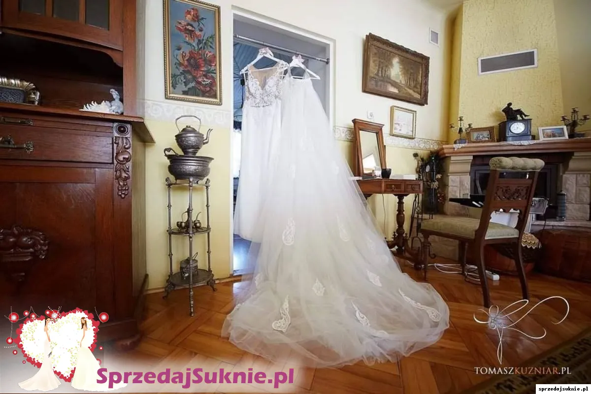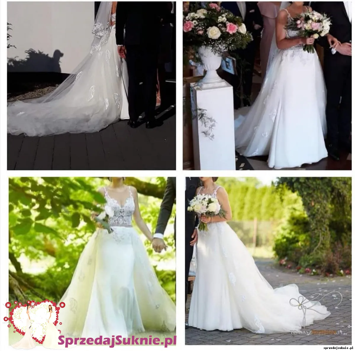 witam mam do sprzedania piekna suknie slubna plus w gratisie daje tren ktory jest nakladany na suknie z paskiem swaroskiego. Tren ma 3 m