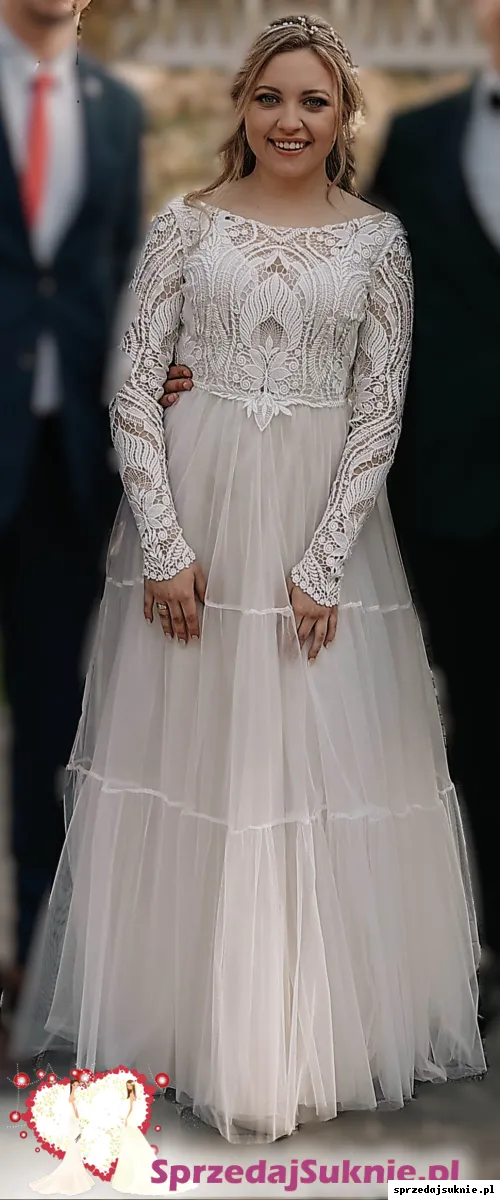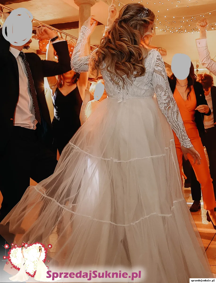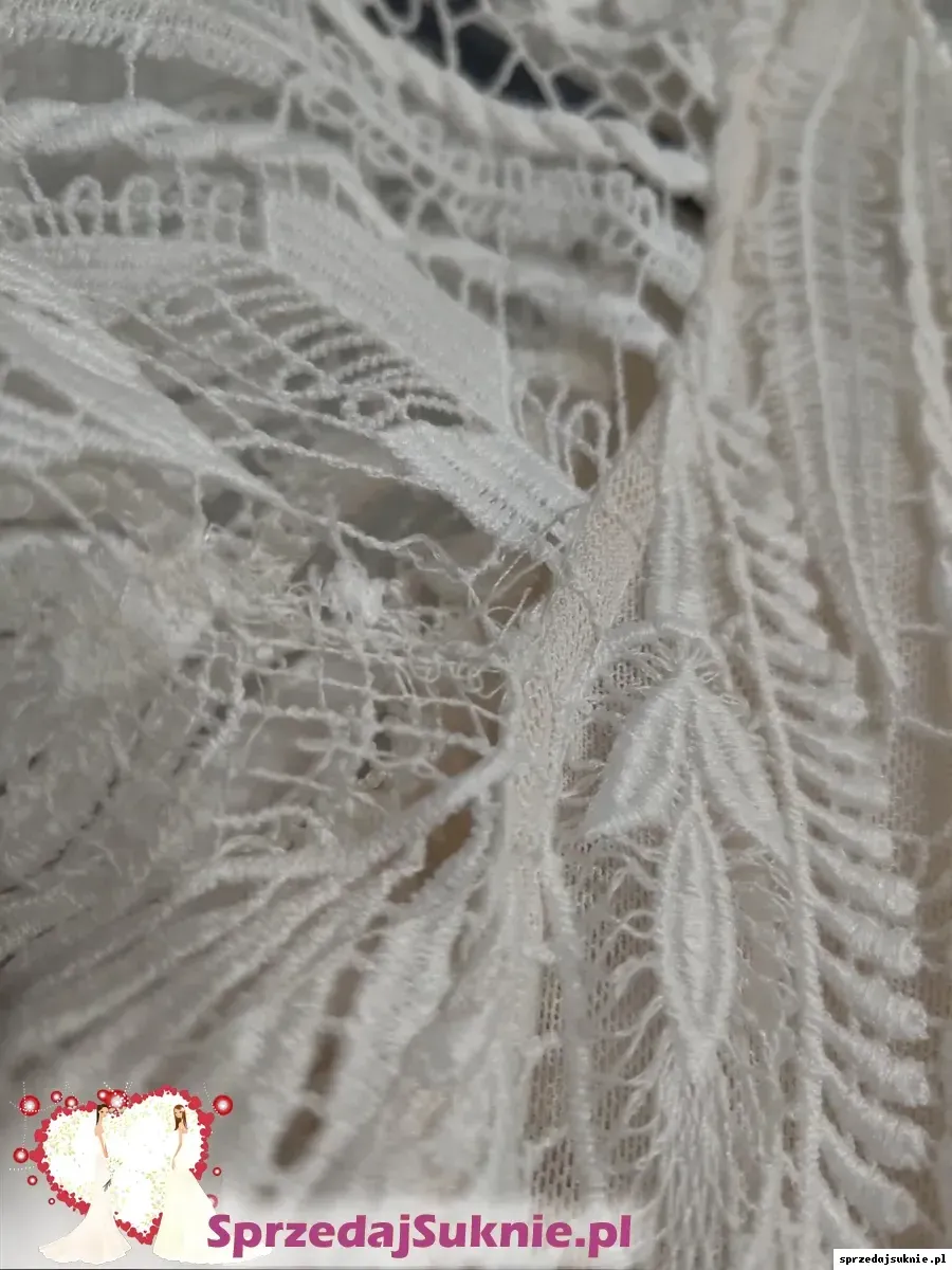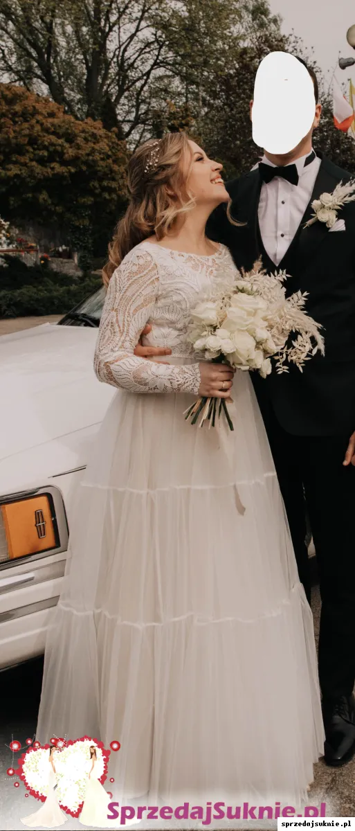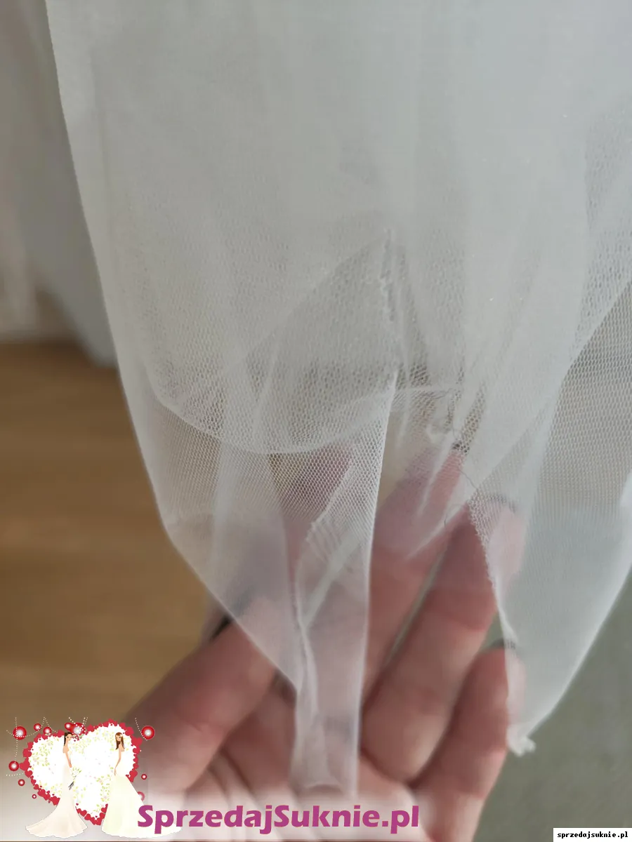 Mam na sprzedaż suknie ślubną zamówioną w 2023 r. w salonie White Lovers w Gdyni. Sukienka została uszyta z 2 modelów "Yucca" (góra), "Festival" (dół).Góra wykonana z gipiury z podszewką, dół to delikatny, 3 warstwowy tiul a pod nim 2 warstwy podszewki. Dekolt w łódkę, a plecy w V i z tyłu jest ona zapinana na zamek. Sukienka jest bardzo lekka i delikatna. Koronka pod pachą posiada małą dziurkę. Niestety tiulowy, bardzo cienki dół może posiadać lekkie rozerwania (jedno największe zauważyłam i jest na zdjęciu) ale z racji tego że jest to kilka warstw materiału, nie widać tego gdy sukienka jest założona.